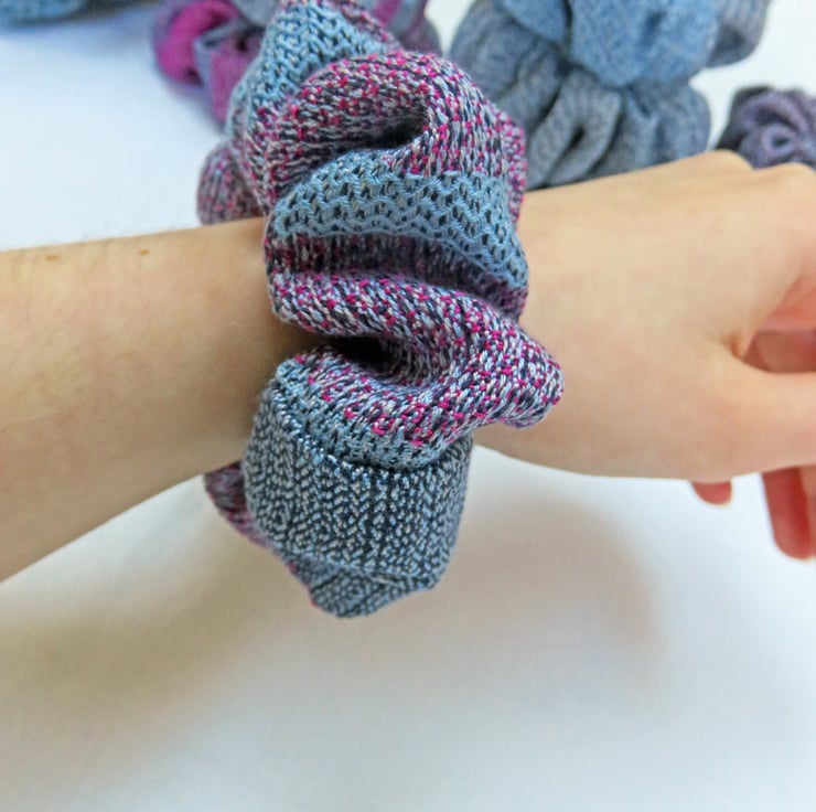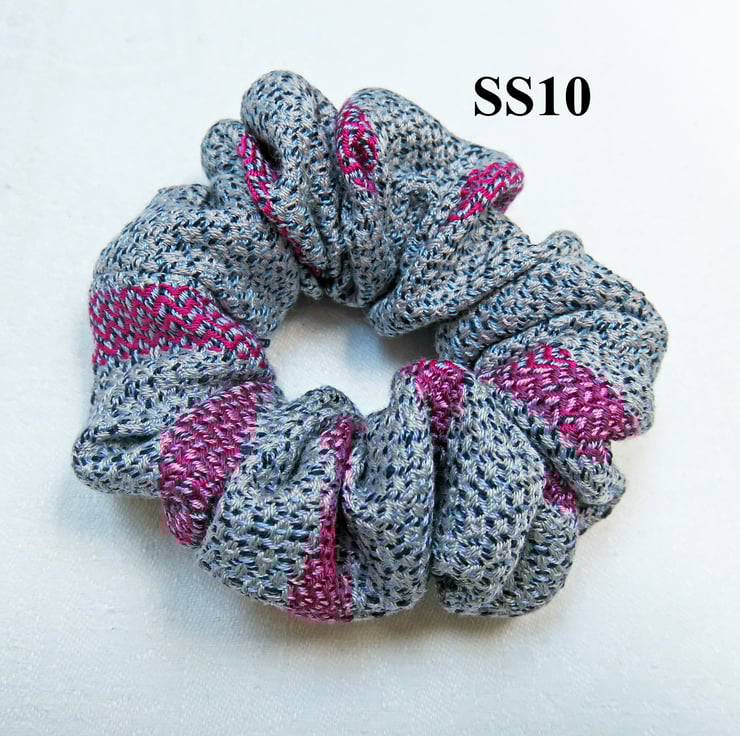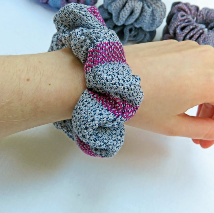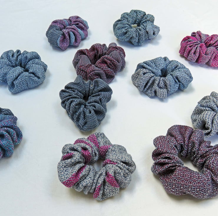 All the scrunchies are made from handwoven fabric, woven on my table loom and then sewn together on a sewing machine, an elastic band inserted and then finished by hand.