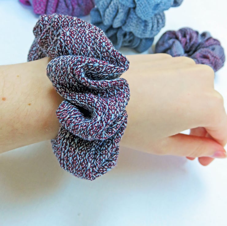 All the scrunchies are made from handwoven fabric, woven on my table loom and then sewn together on a sewing machine, an elastic band inserted and then finished by hand.