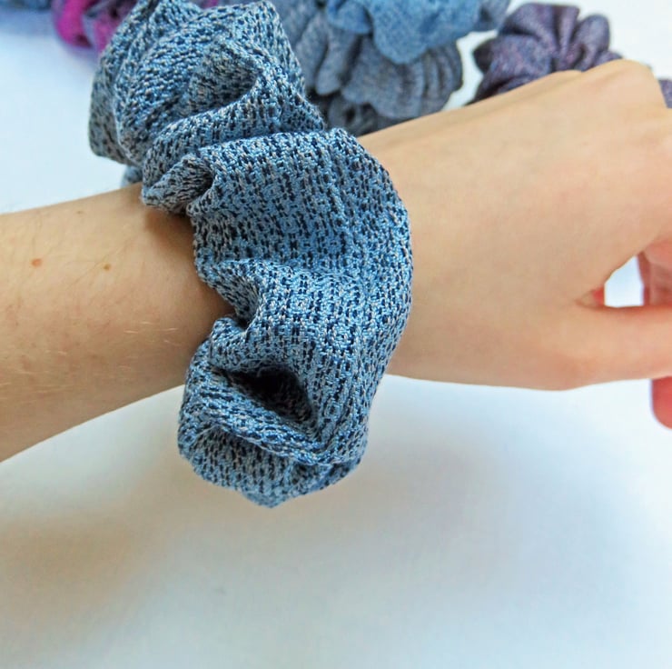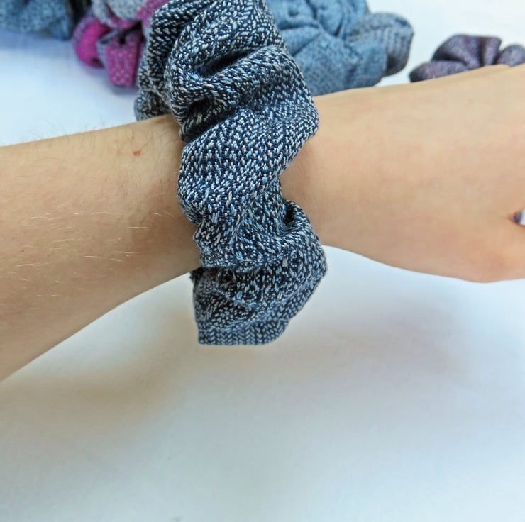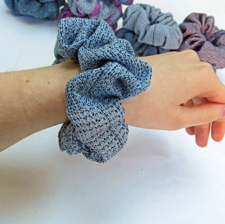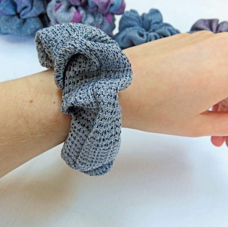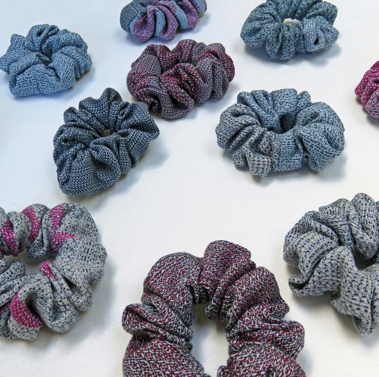 All the scrunchies are made from handwoven fabric, woven on my table loom and then sewn together on a sewing machine, an elastic band inserted and then finished by hand.