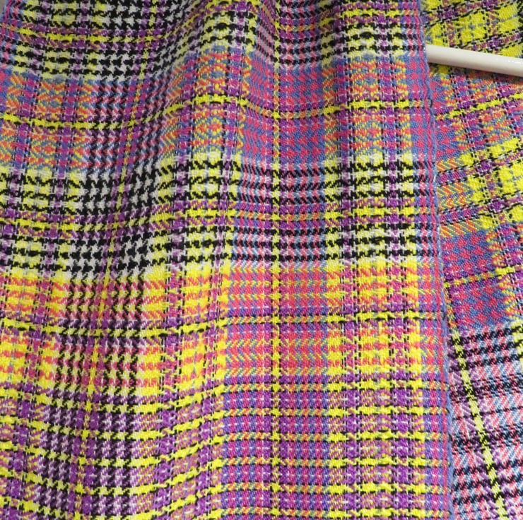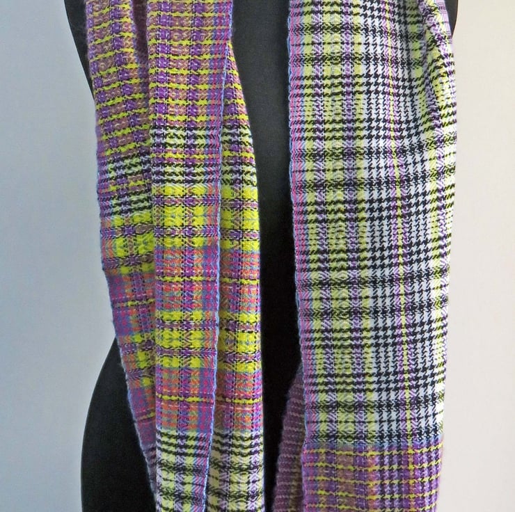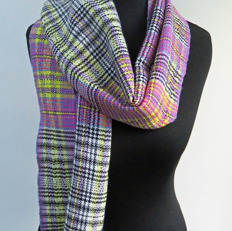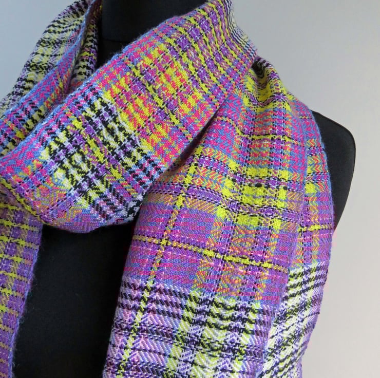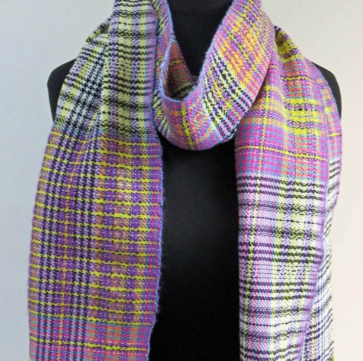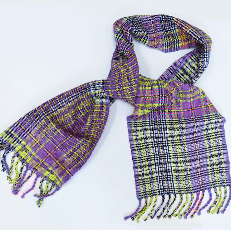 A handwoven tartan scarf, made from 100% fine Merino wool and also some mohair yarn. It has 6 colours in it, which can cause it too look quite busy - it has blue, pink, yellow, purple, black and white in it.