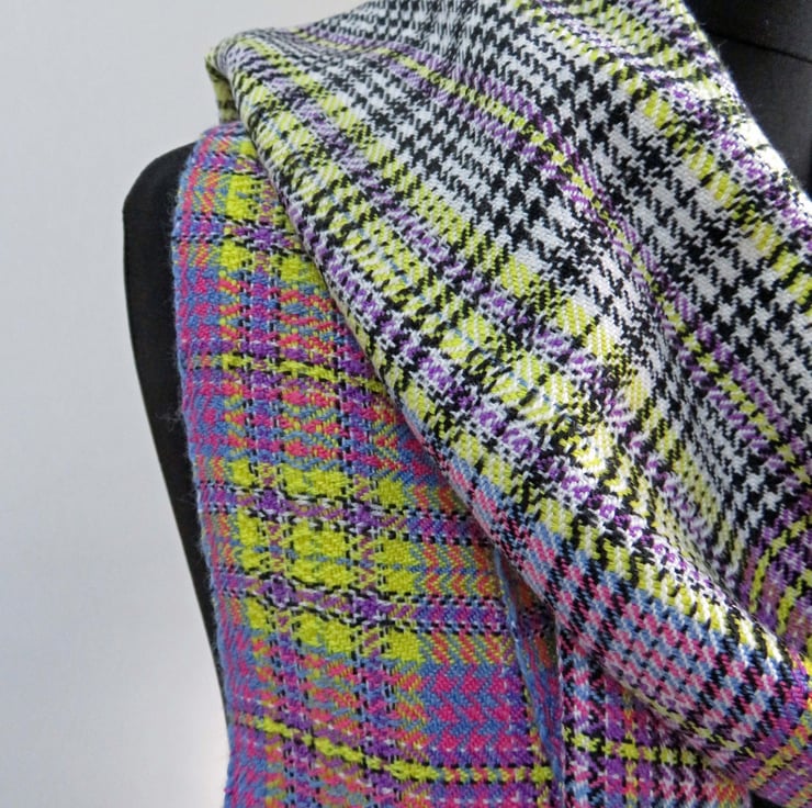 The pattern on this scarf is overall a contemporary take on a tartan, but it also has element of houndstooth and a repeated section creating a stripe across the width.