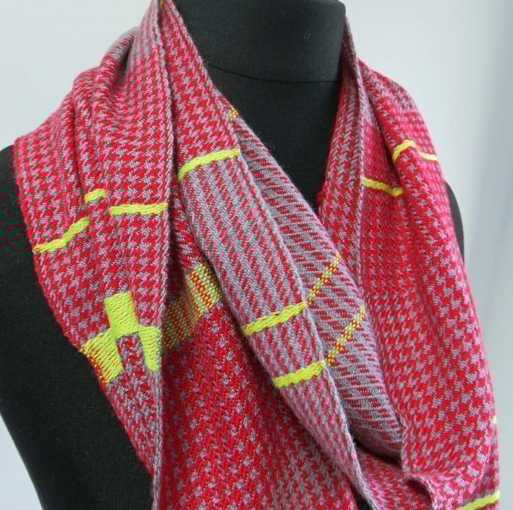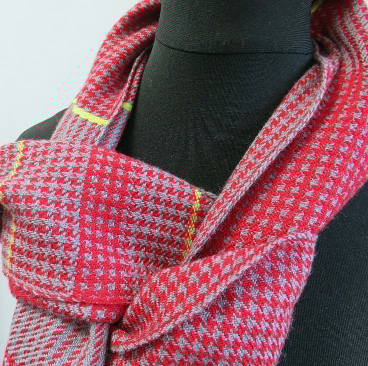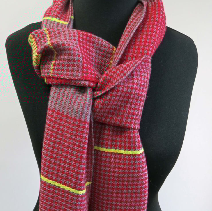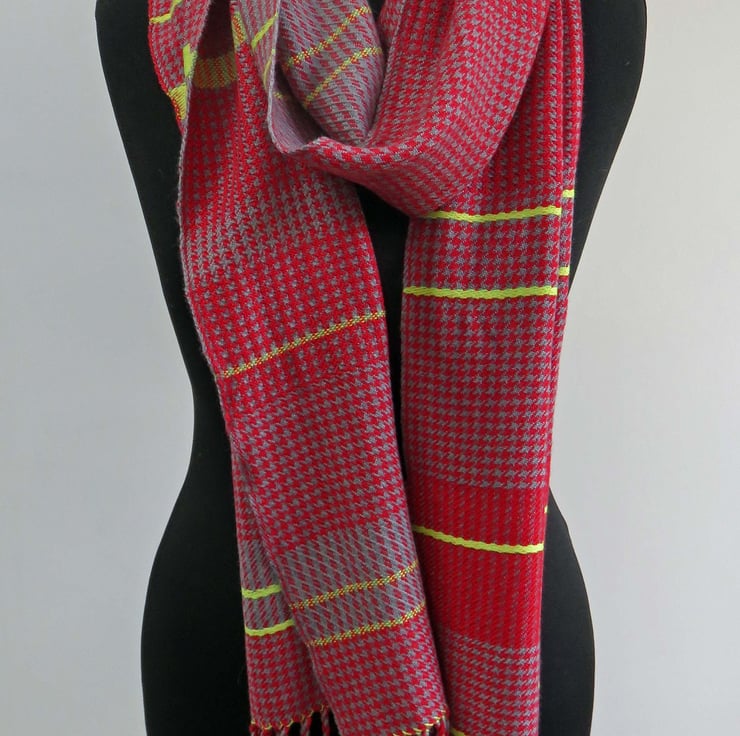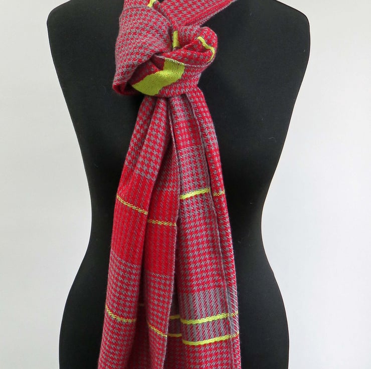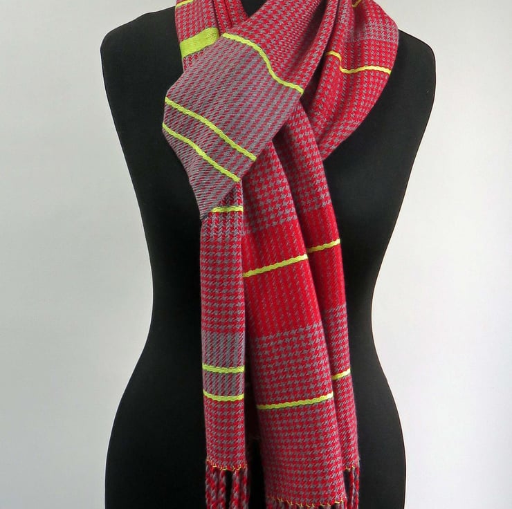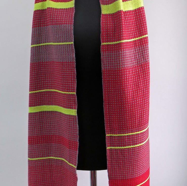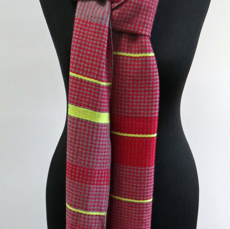 A handwoven scarf, in 100% Merino Wool, made entirely by hand: from weaving, to twisting the tassels, washing, trimming and pressing.