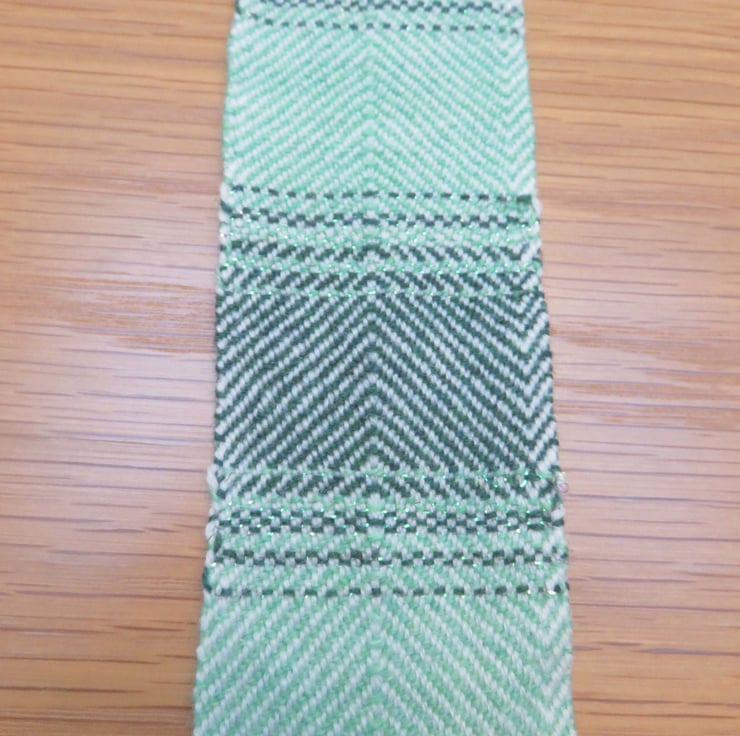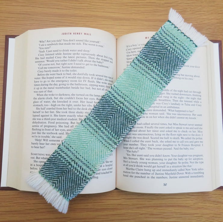 Handwoven fringed bookmark made with a high quality ecru lambswool warp and a two tone green ombre pattern running down the length. Although it is not easy to see in the pictures there is lurex -a sparkly plastic yarn- where the two greens blend.