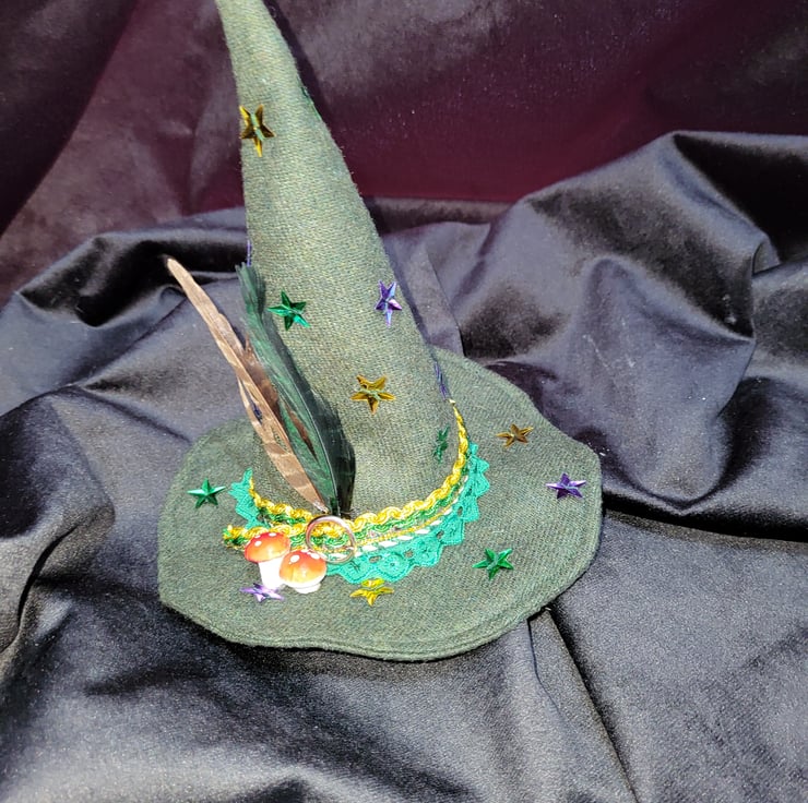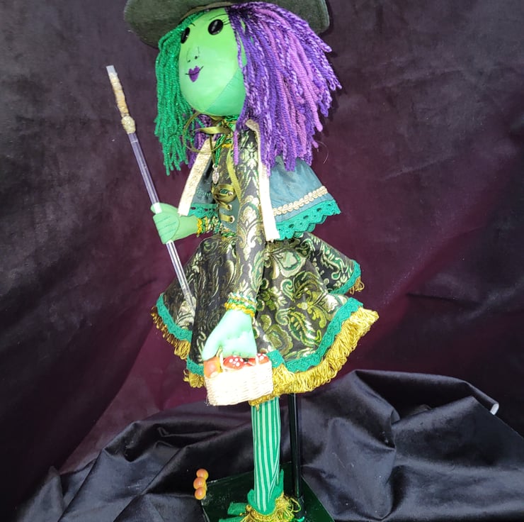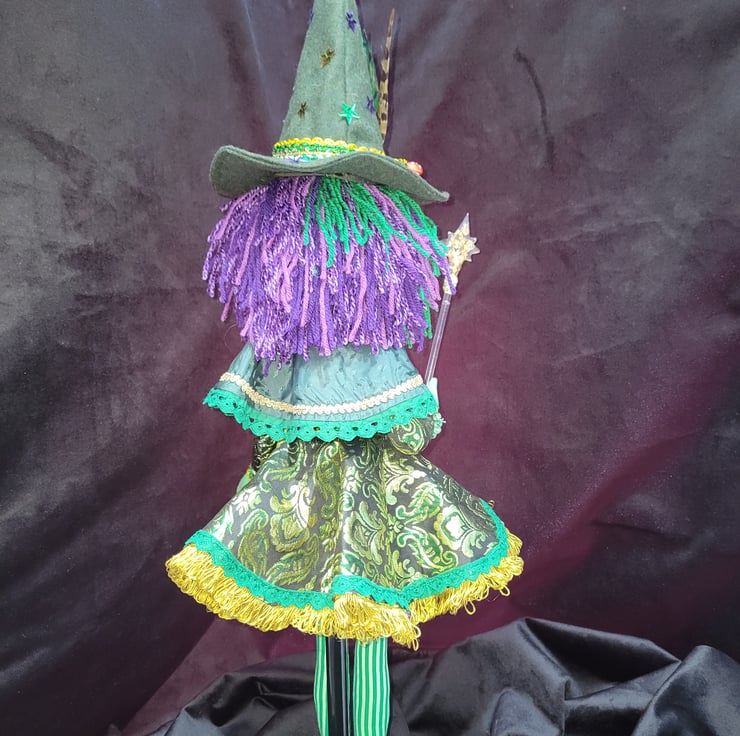 Her lovely hat is made of green woollen fabric, that’s finished off with stars and feather plumes. Her dress has a full circular skirt and a fringed trim. She’s a pretty witch that is themed in green with highlights of purple.