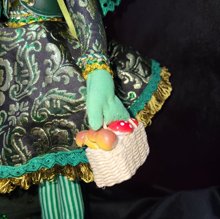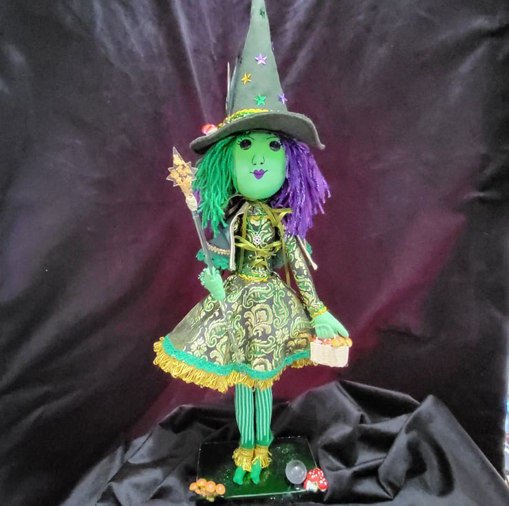 I found a beautiful piece of green & gold lurex fabric. It made me think of a pretty witch. A few days later a beautiful piece of woollen fabric was given to me, ths fabric made the perfect hat!! She's inspired by the thought that witches can be pretty, not all green witches are ugly.