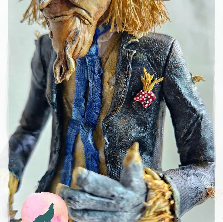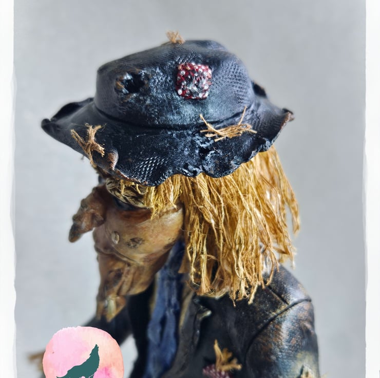 Worzel wearing his best head while doing his best to scare the birds from the fields and pursuing his great love.