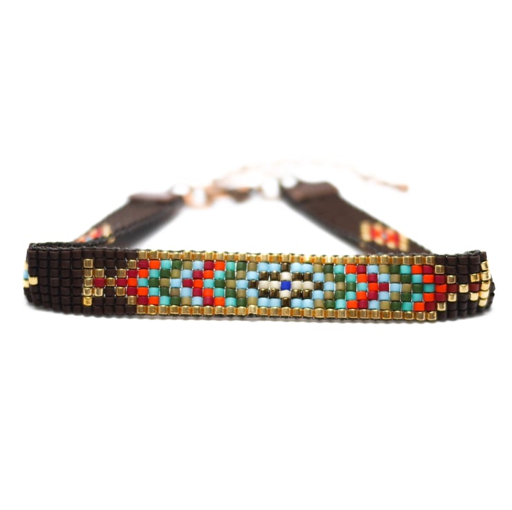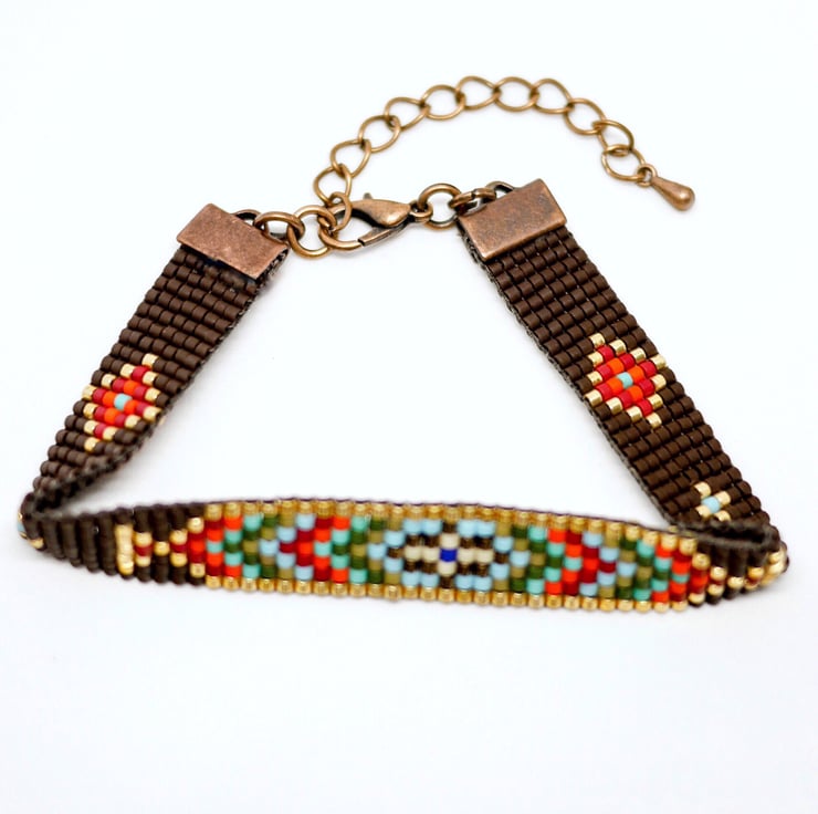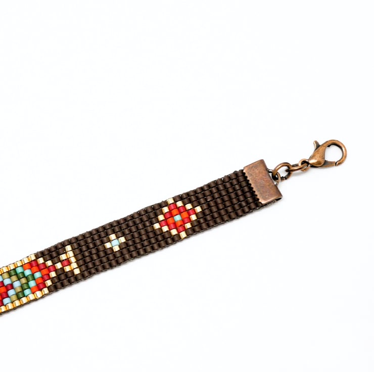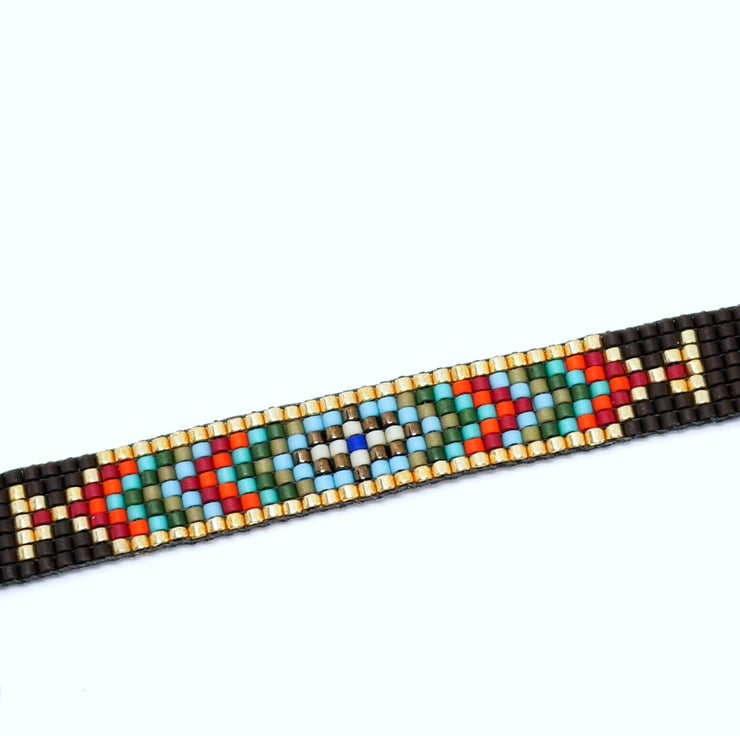 This beautiful beaded bracelet was handwoven by me on a traditional beading loom, and features my own design and colour scheme. Perfect for lovers of all Native American beadwork, the bracelet features matt dark brown Japanese Delica beads, complemented with deep reds, oranges, greens and blues. The design is bordered with metallic gold Delica, giving those gold colours extra oomph!