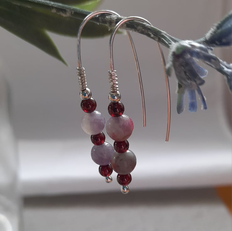 These earrings have been handmade out of recycled argentium silver wire with unusual plum blossom tourmaline with colours of lilac, purple and pink and deep red garnet semi precious gemstones