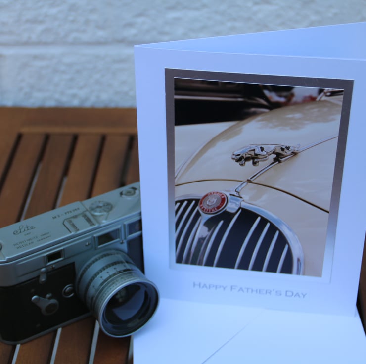 Photograph of a classic 3.8 litre Jaguar car, showing the Jaguar mascot and radiator badge, on a cream coloured car. Perfect for all those who appreciate vintage and classic cars.