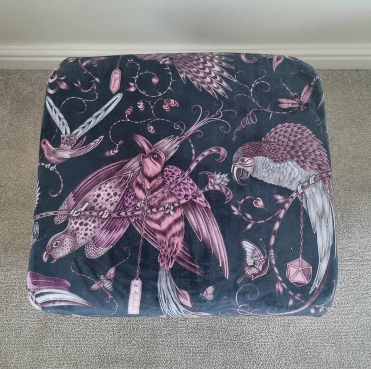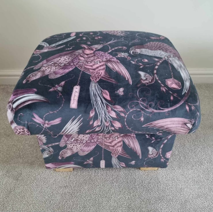 I am a professional upholsterer with over 33 years experience, and have handmade this adult sized STORAGE footstool using Emma Shipley Audubon Pink Velvet fabric.