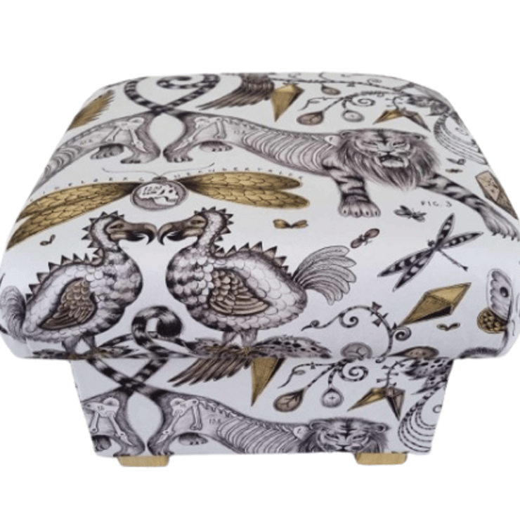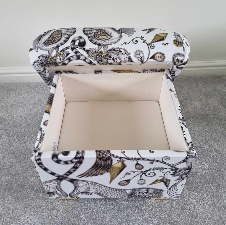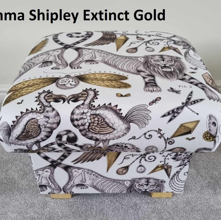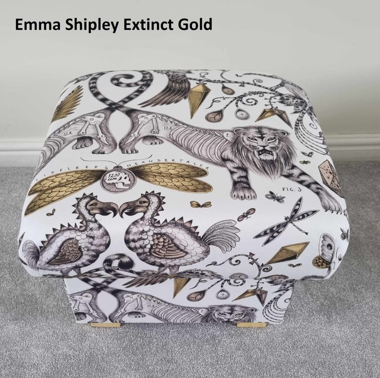 I am a professional upholsterer with over 33 years experience, and have handmade this adult sized STORAGE footstool using Emma Shipley Extinct Gold Sateen fabric.