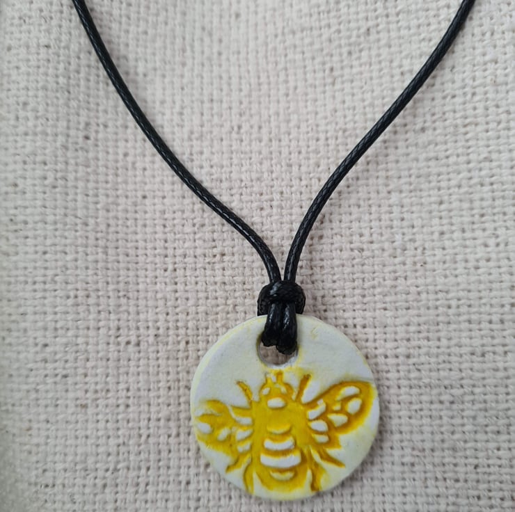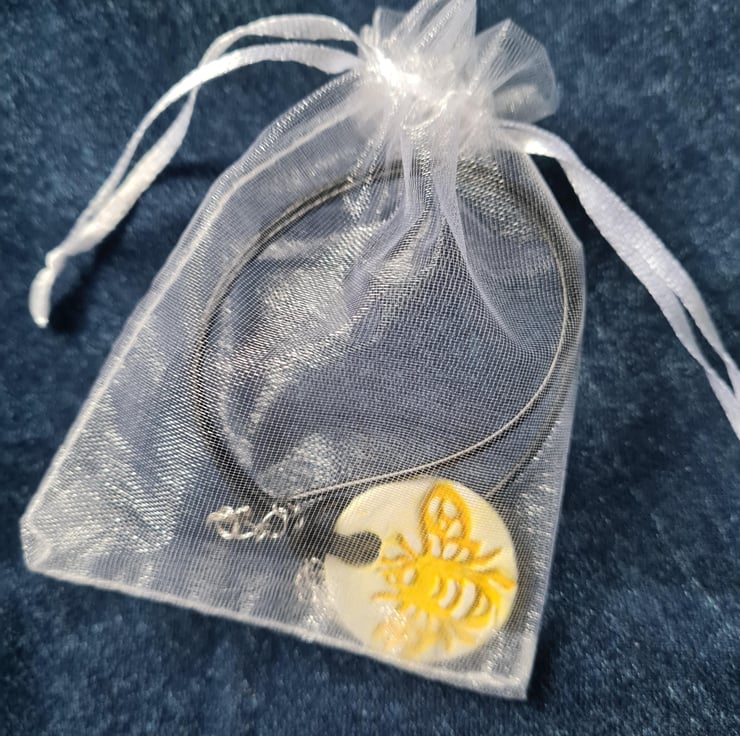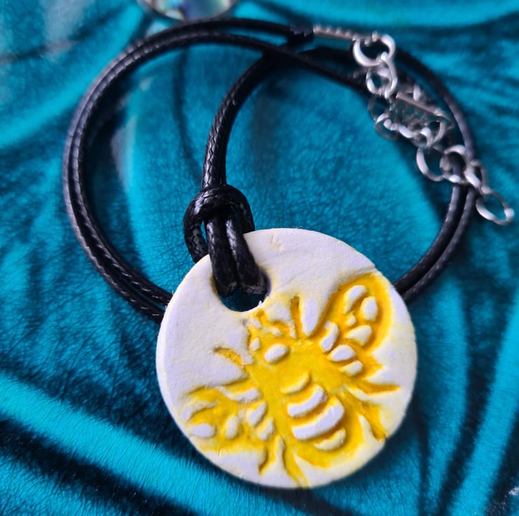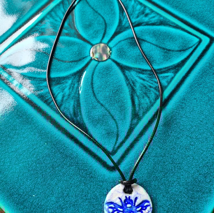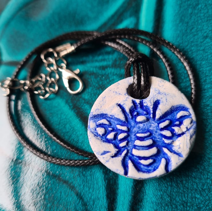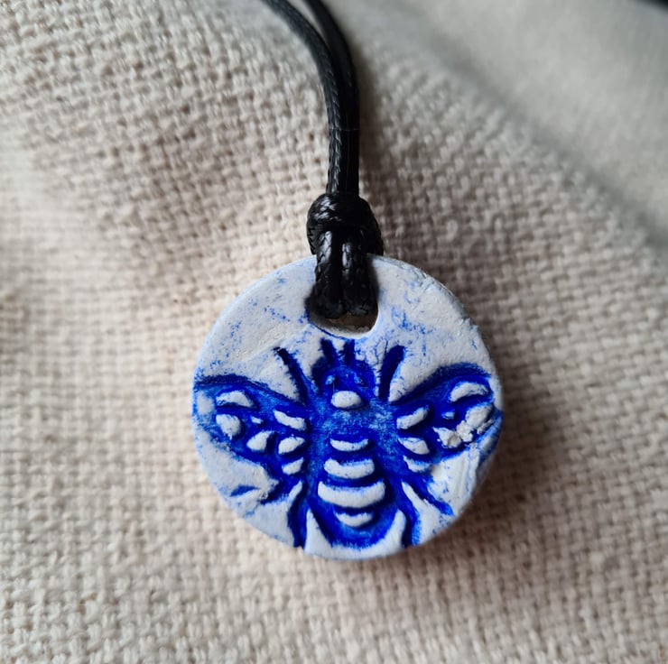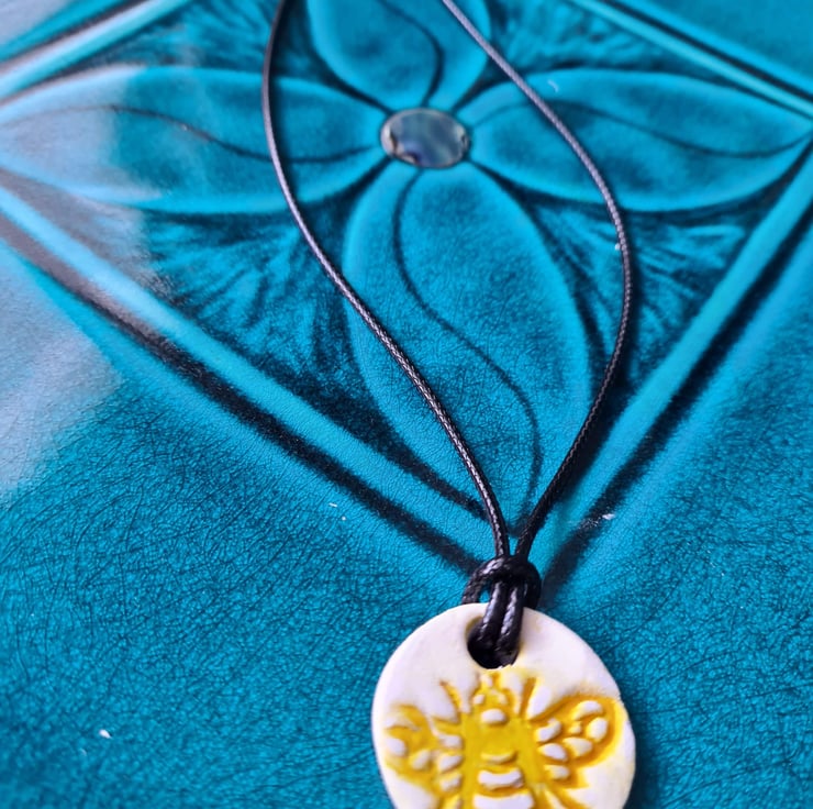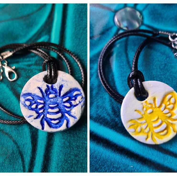 This pendant is made from air drying clay which I have embossed with a pretty bee stamp. After drying I gave it a light sand to smooth the edges and then painted it before varnishing to finish. It is available in two colours: blue or yellow.
