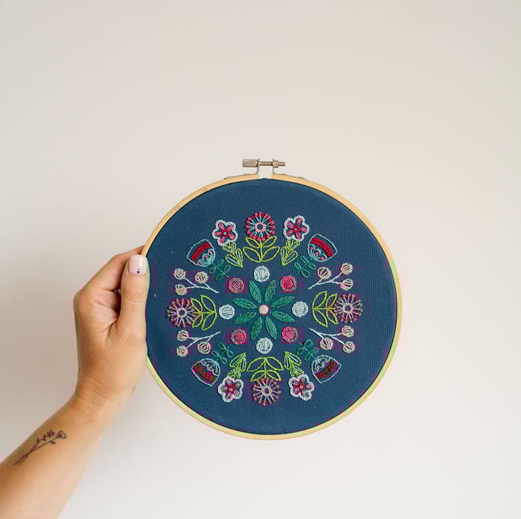 Unwind and relax with this charming folk art-inspired flower mandala embroidery kit. The vibrant colours and intricate design will look stunning on display, adding a touch of beauty and creativity to any space.