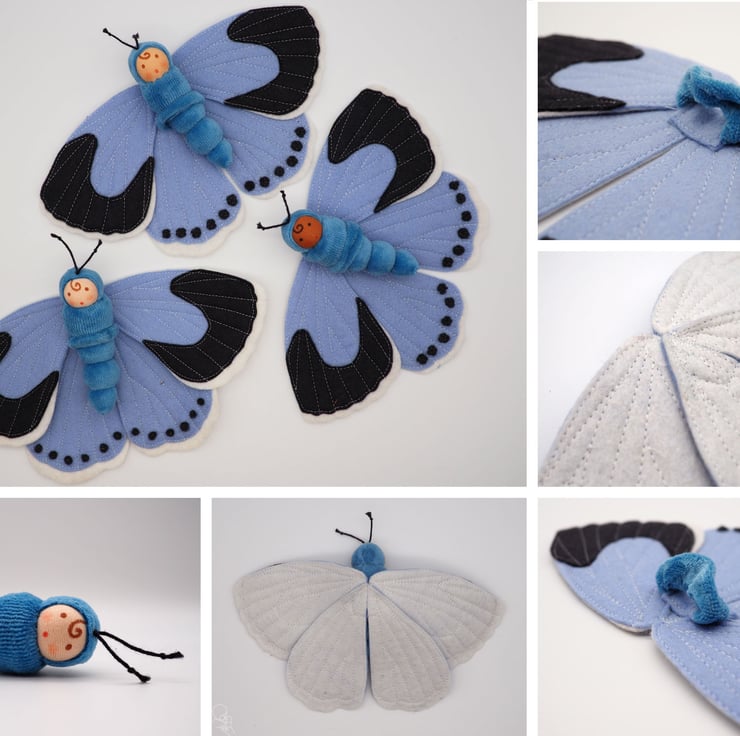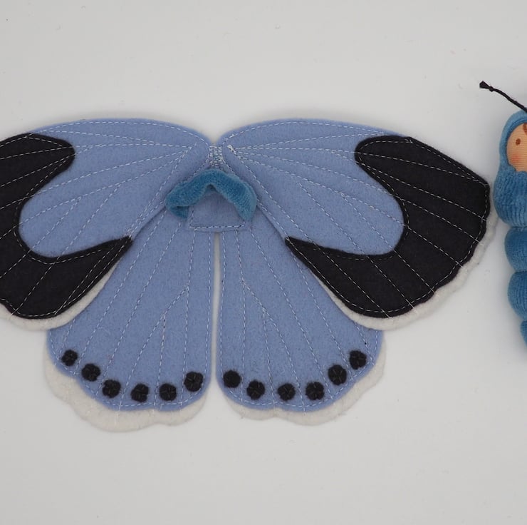 The wings are layers of felt cut by hand and then machine appliquéd on for strength - not glue! Please note that because of this the stitches show through to the back of the wings - as can been seen in the photos.
