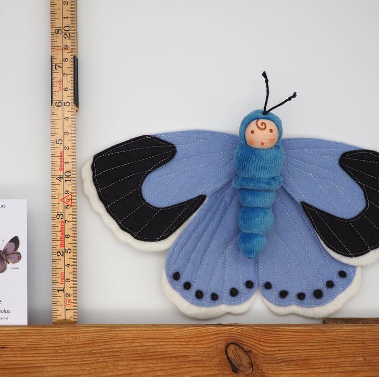 Butterfly wing span is 24 cm and the height of the caterpillar doll is 9.5 cm.
