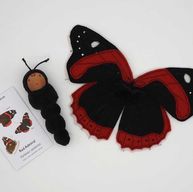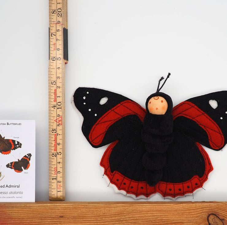 Butterfly wing span is 19 cm and the height of the caterpillar doll is 9.5 cm.