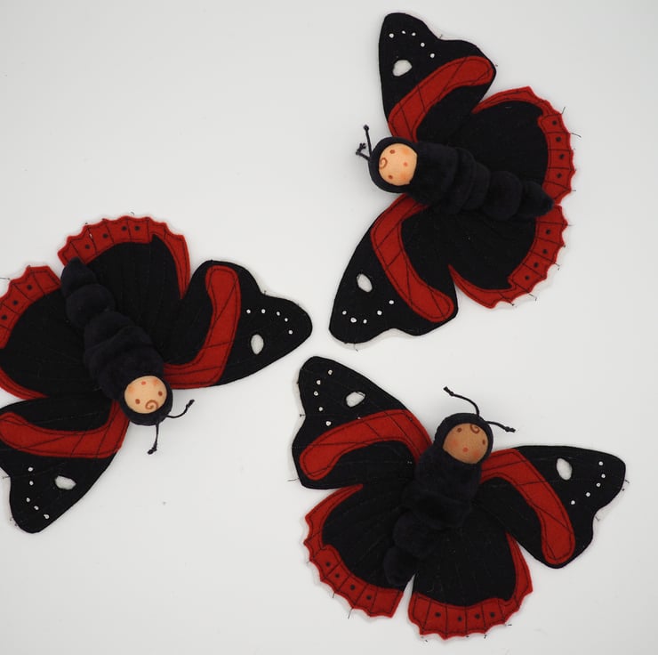 The wings are layers of felt cut by hand and then machine appliquéd on for strength - not glue! Please note that because of this the stitches show through to the back of the wings - as can been seen in the photos.