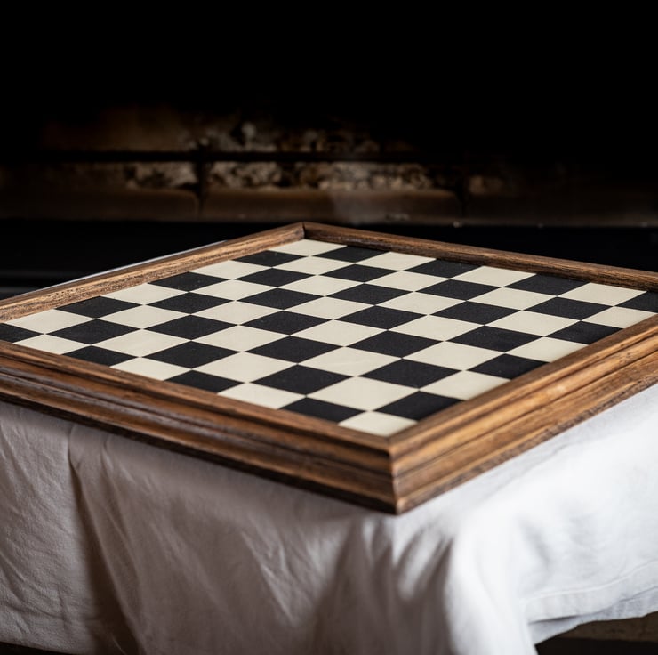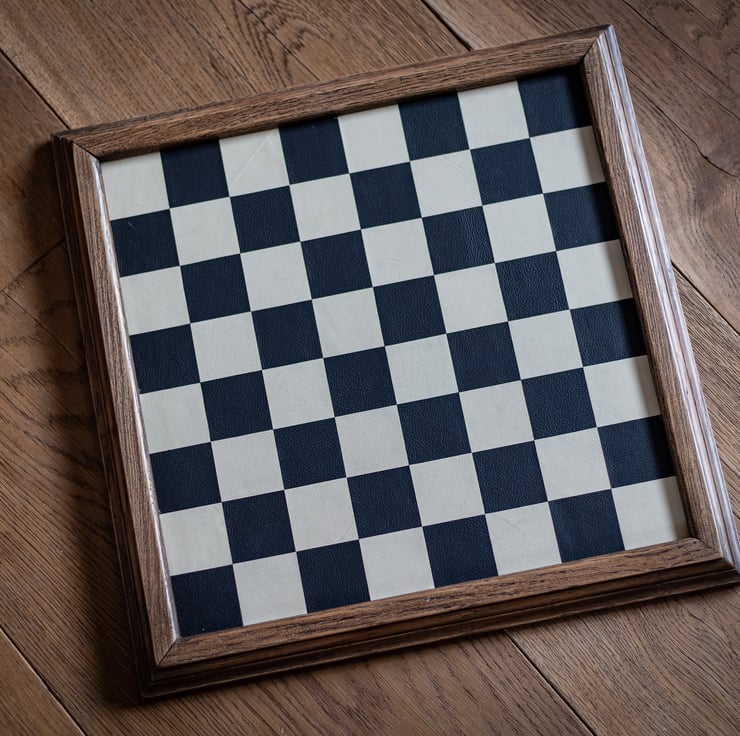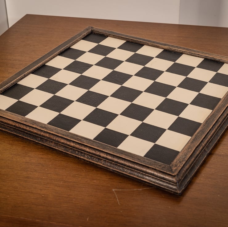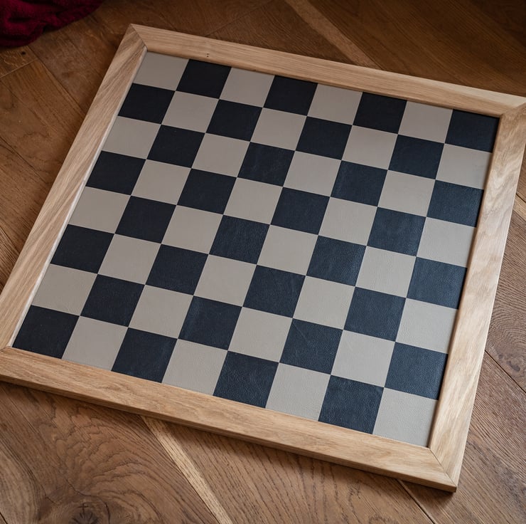 Our handmade chessboards are finished in leather, over a 1/2" (12mm) plywood base, with a solid oak edging. This item is made to order, and we aim to produce and dispatch it as quickly as possible.