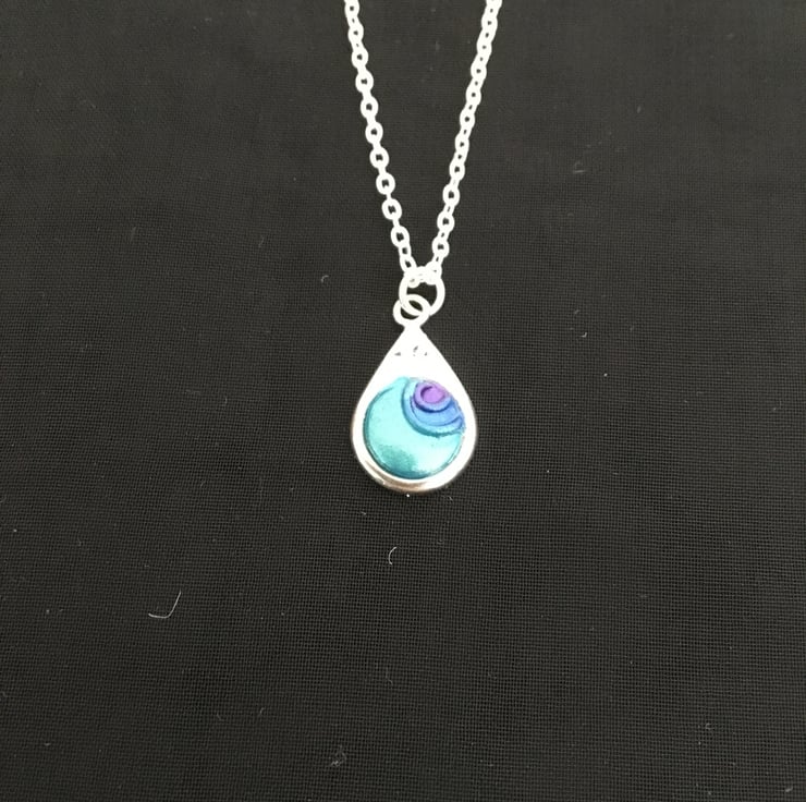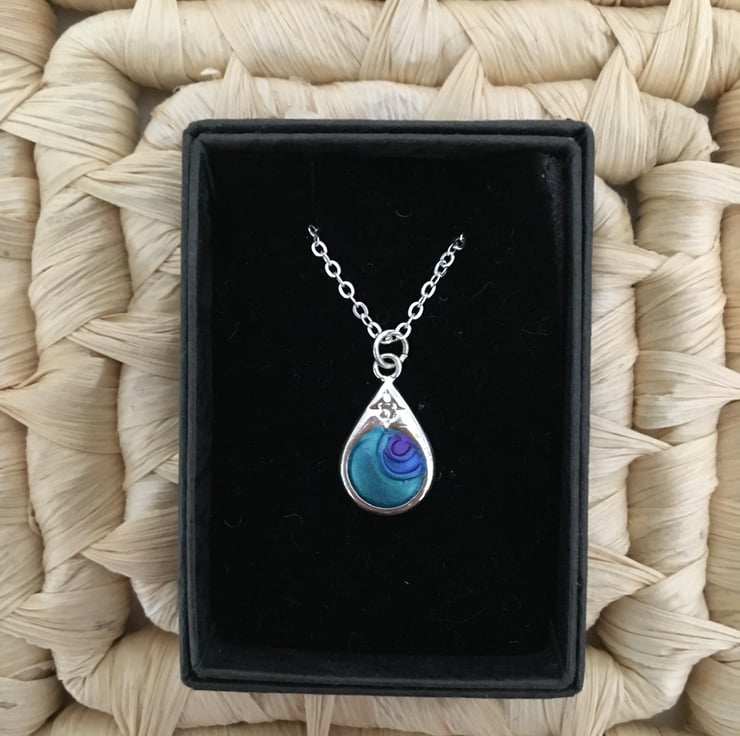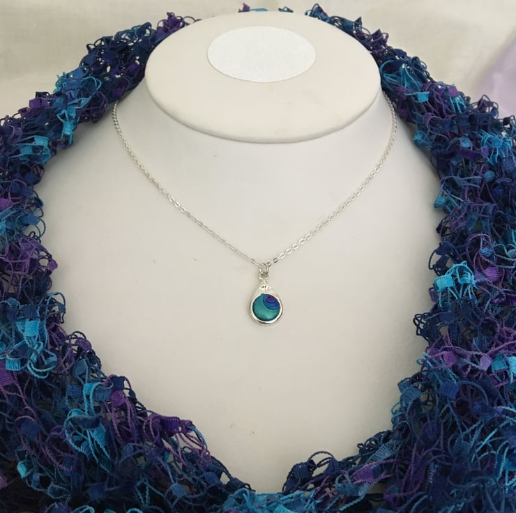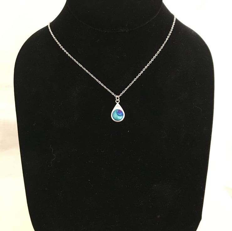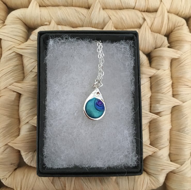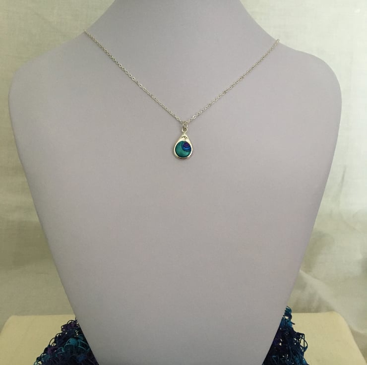 A lovely peacock coloured centred pendant in a quality silver tone setting.