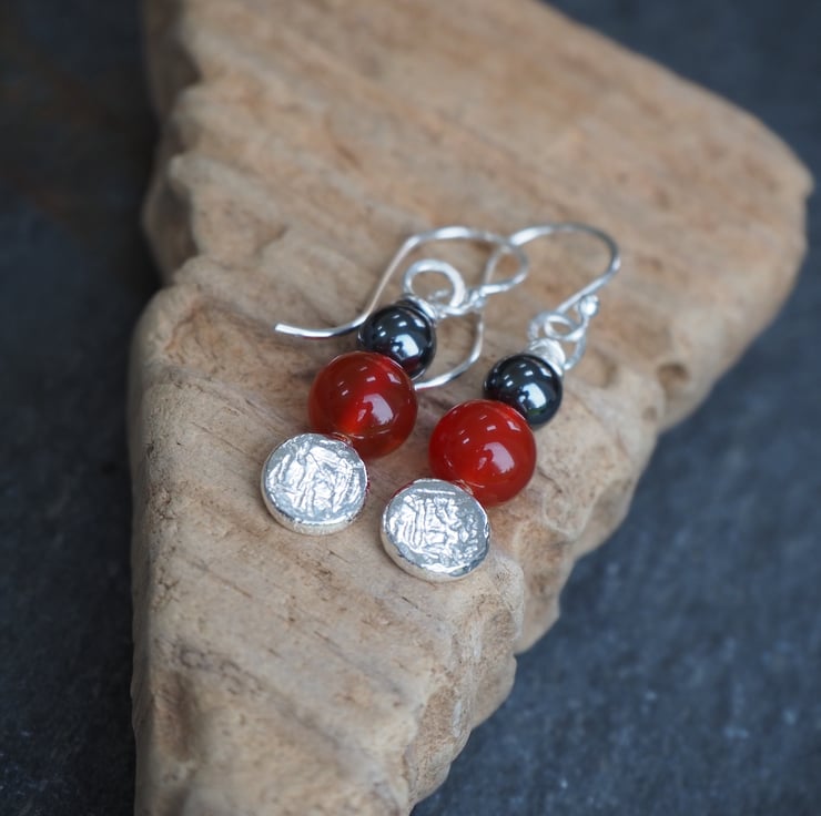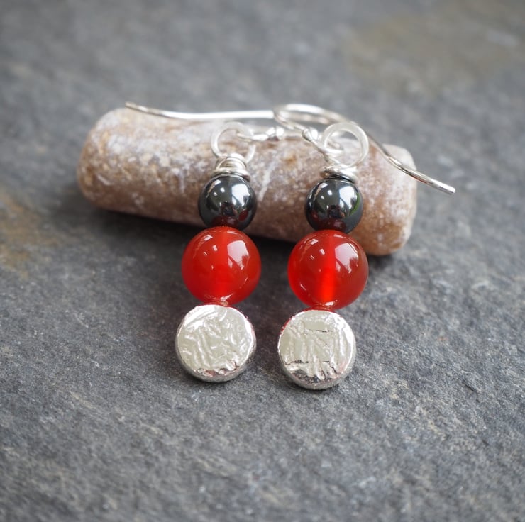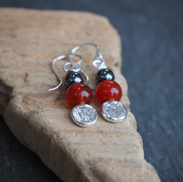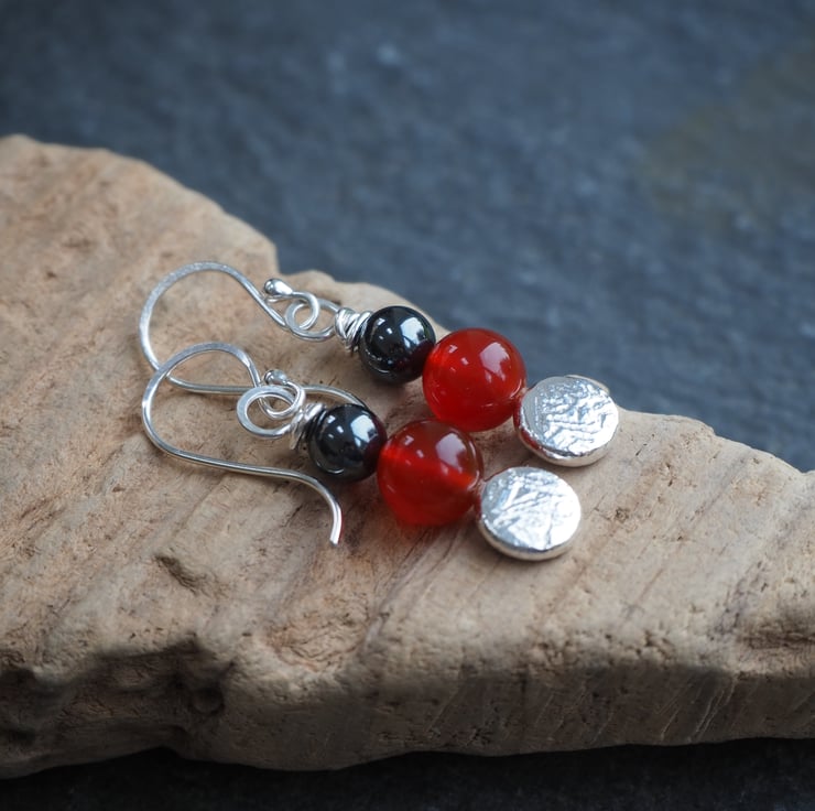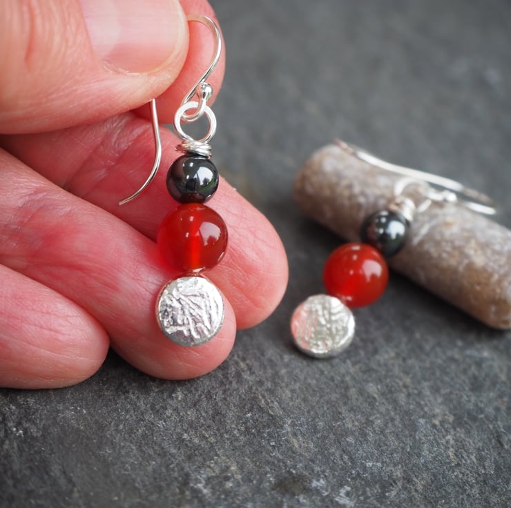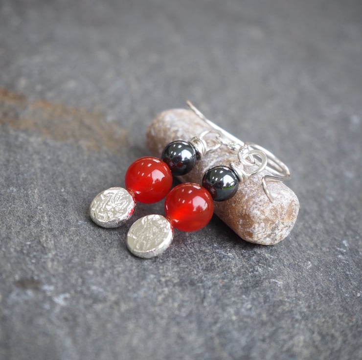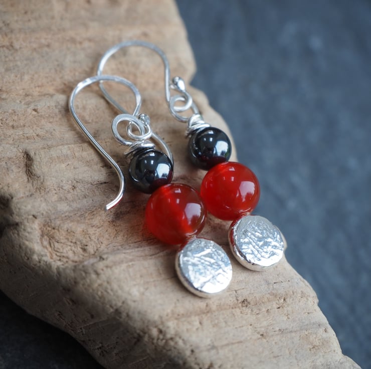 Materials: Earrings are handmade using Argentium Silver 940 (hypoallergenic & ideal for sensitive skin - I use this for all my ear pins, wires and backs because it's less likely to cause irritation). Argentium silver is recycled, so it's a great eco option and it doesn't tarnish in the way that sterling silver does. Quality carnelian and hematite beads.