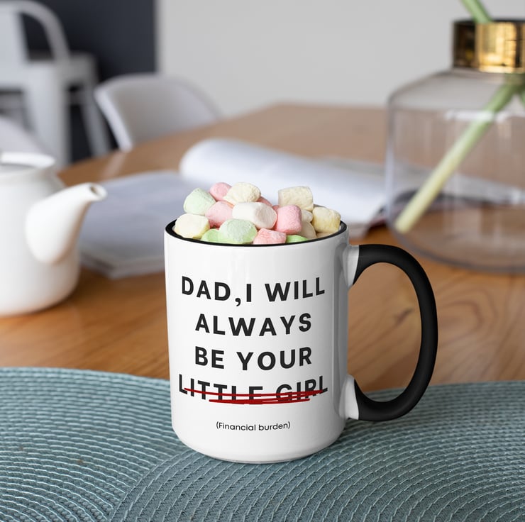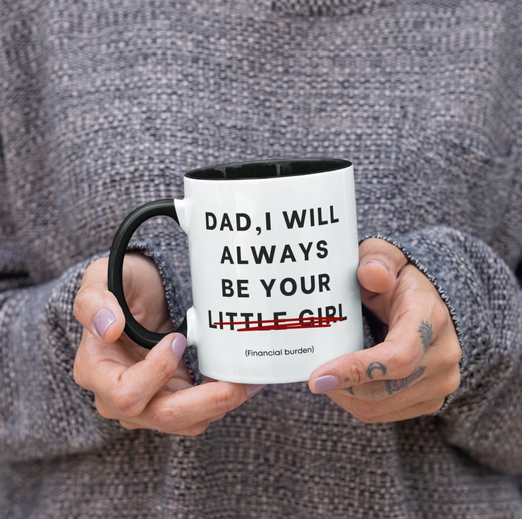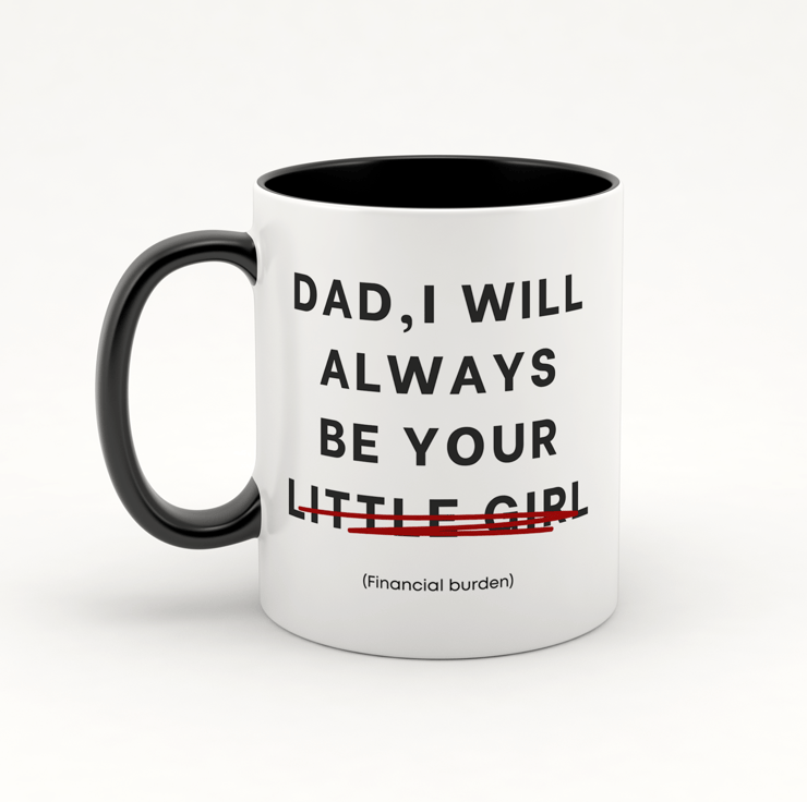 This high-quality ceramic mug features a witty design with "Dad, I Will Always Be Your Little Girl" cleverly crossed out and replaced with "Financial Burden." The black handle and interior add a stylish touch, making this mug not only funny but also visually appealing. Whether your dad enjoys his morning coffee, tea, or any hot beverage, this mug will make him laugh every time he uses it.