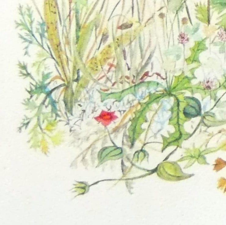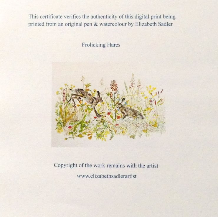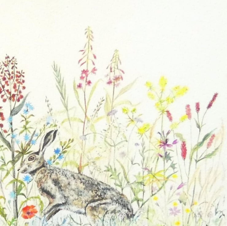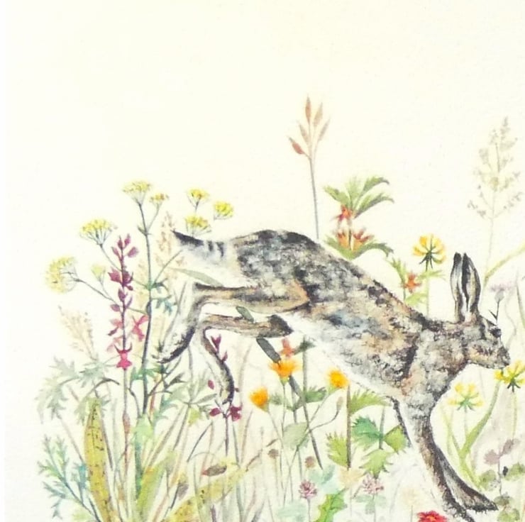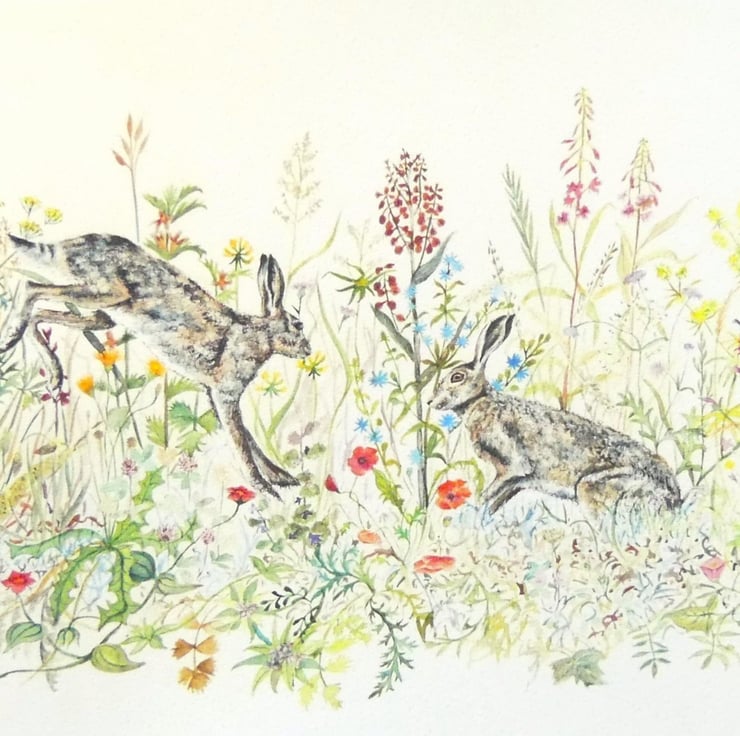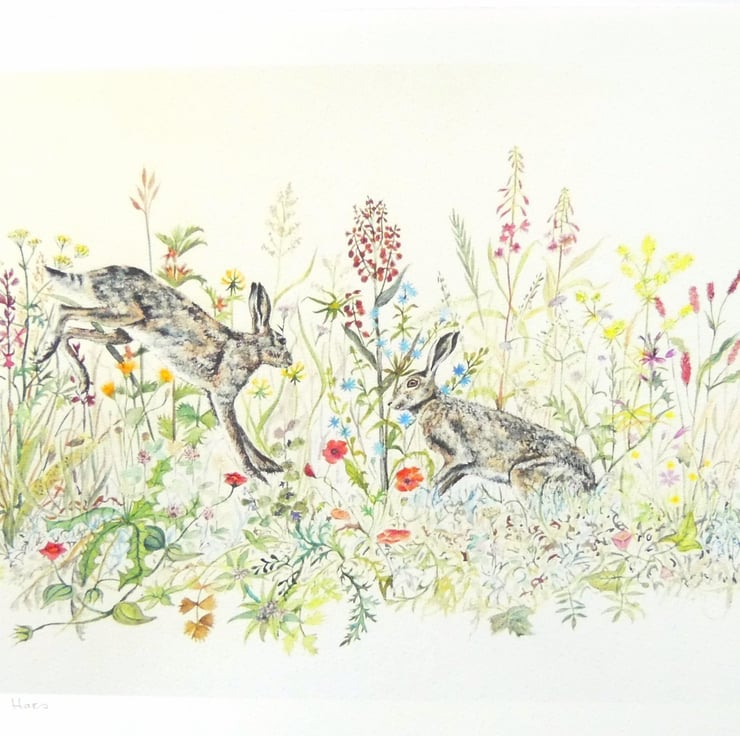 A beautiful print from my original watercolour and ink artwork painted on The Langton watercolour paper with Winsor & Newton and Schmincke watercolour tube paints for intense and vibrant colour. Hares are playing in a meadow rich in wildflowers typically found in the English countryside.