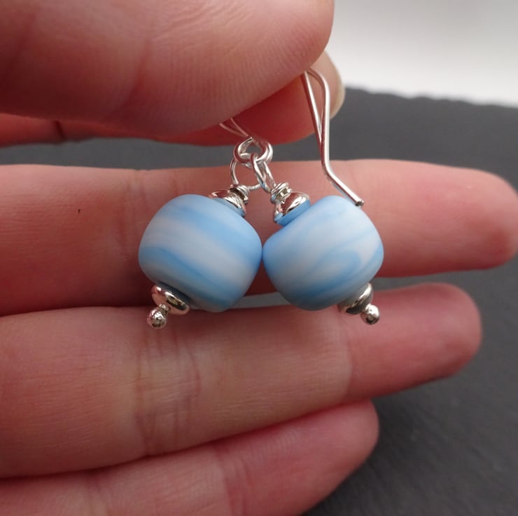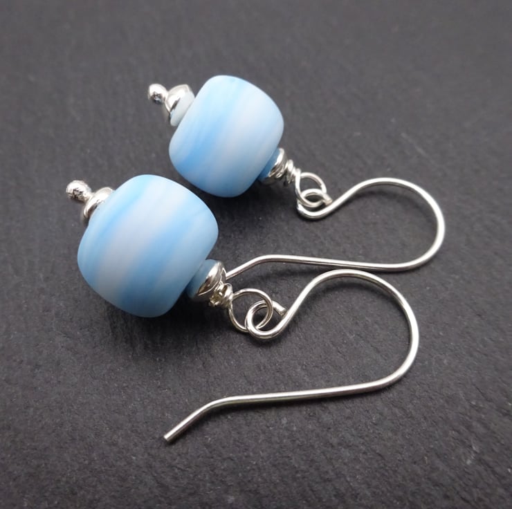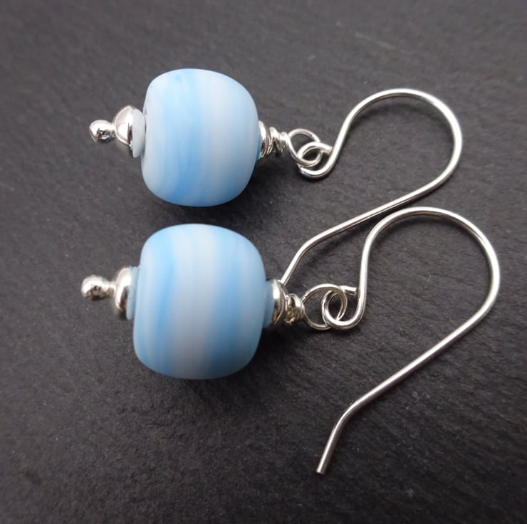 A pair of earrings made with handmade sterling silver earrings, sterling silver beads and handmade lampwork glass beads.