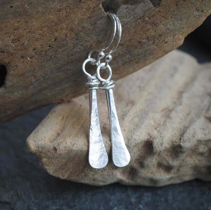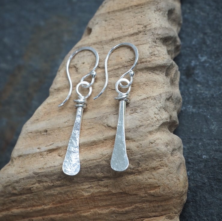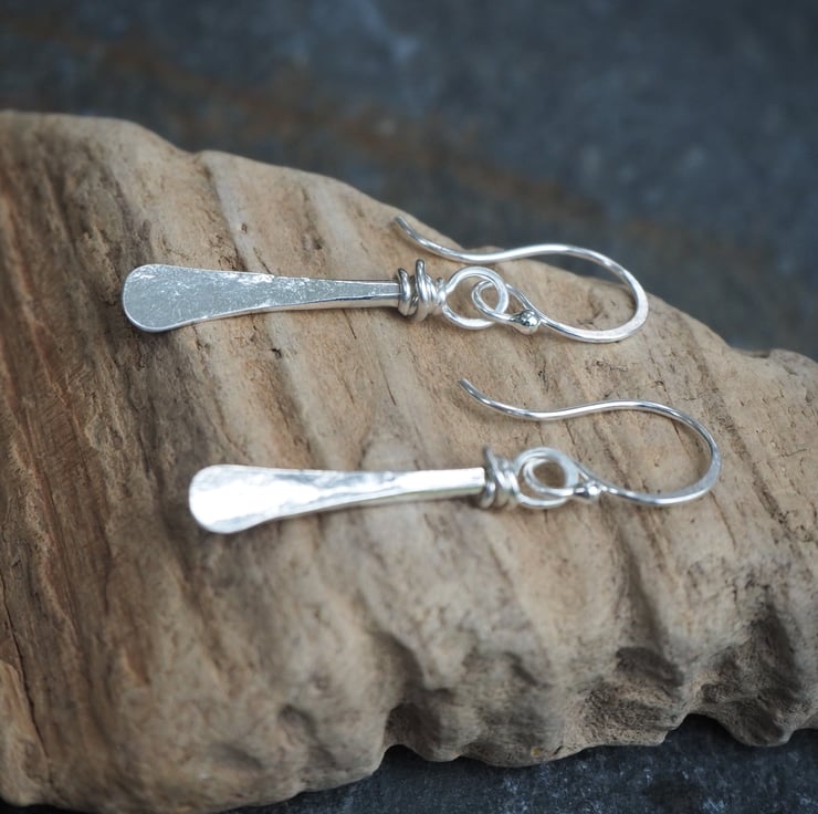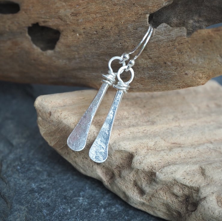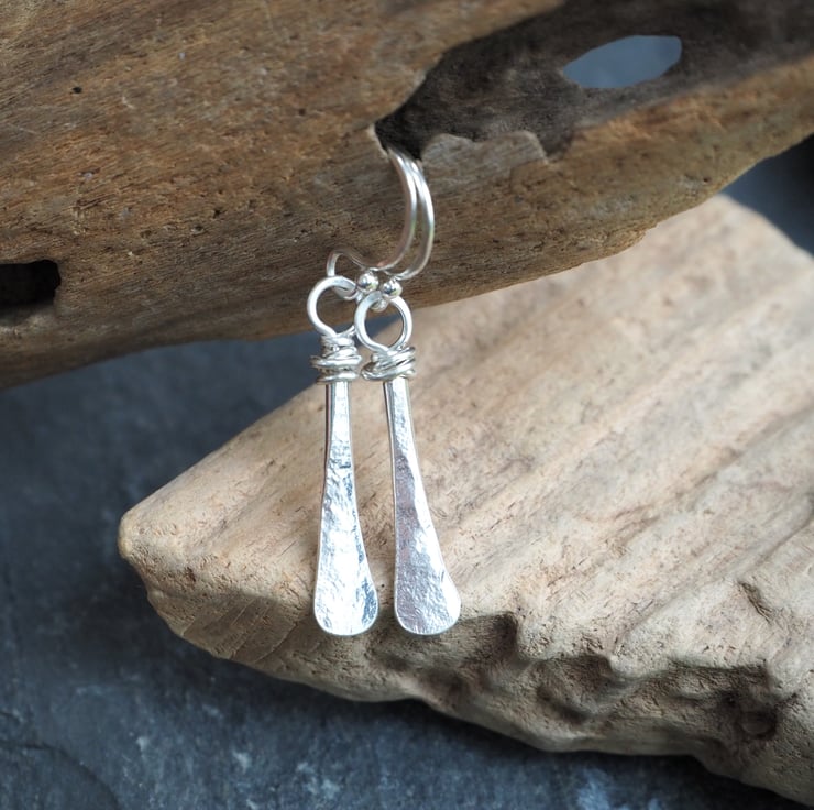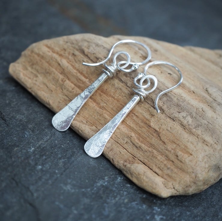 They have a forged rod that has been hammered with one of my vintage hammers to create a lovely texture. They have a twist and loop at the top and hang from handmade hook ear wires.