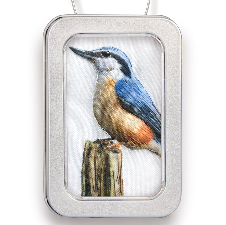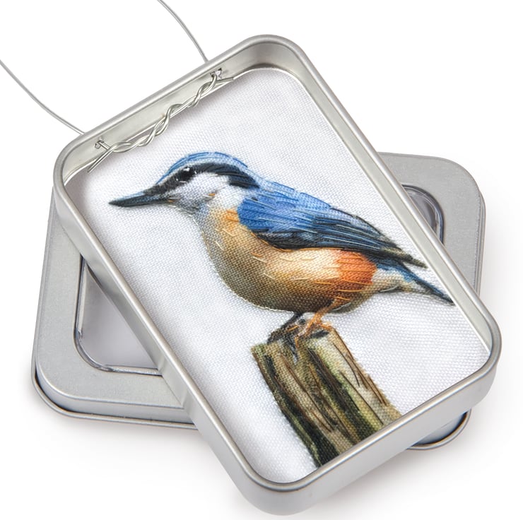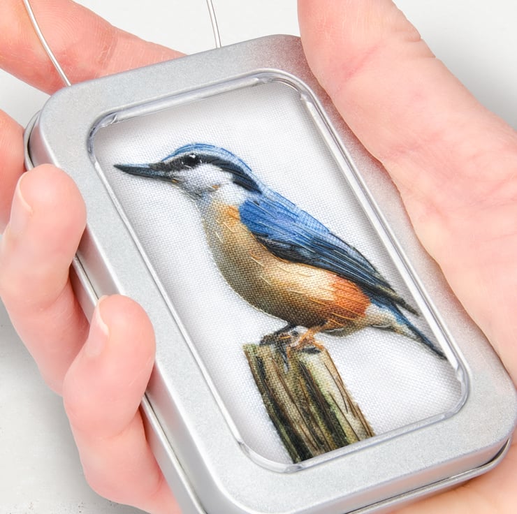 Nuthatch, little 3D fabric Nuthatch picture framed in a tin, gift, ornament
