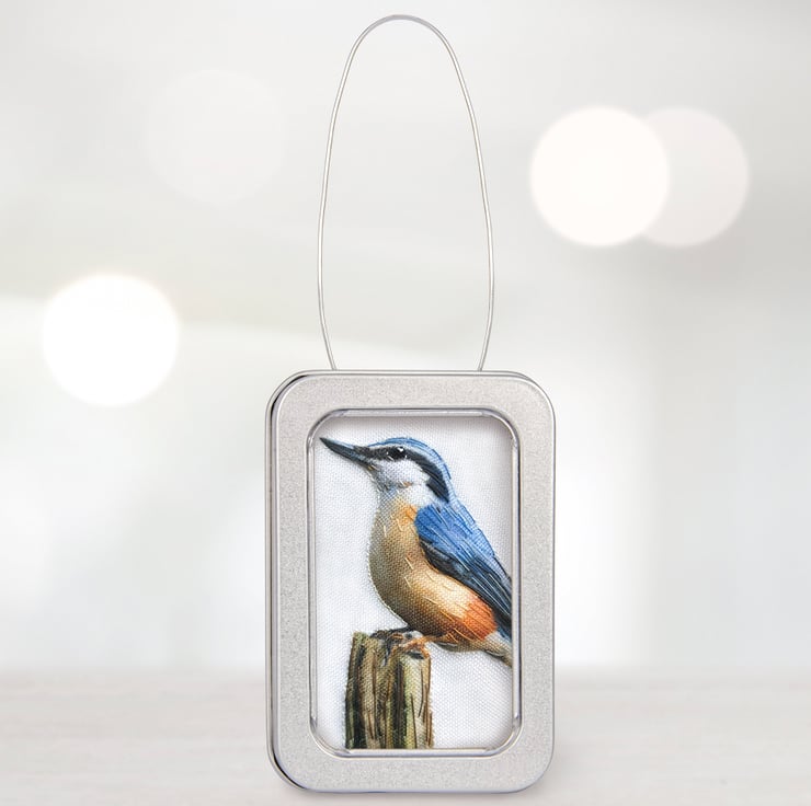 This is a little 3D fabric Nuthatch, framed in a sturdy recyclable aluminium tin, with a wire hanger.