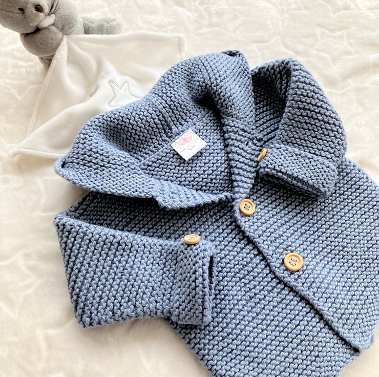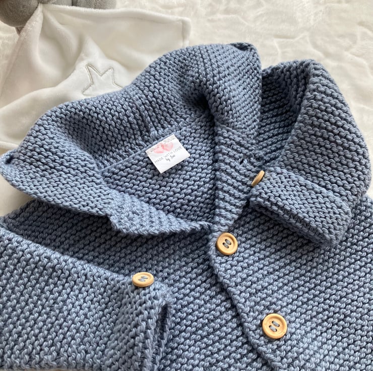 Hand-knitted baby boy’s hoody to fit from 0-3 months. I have knitted this cute little hoody in a super soft smoky denim blue coloured cotton yarn and finished it off with wooden buttons on the front fastenings and cuffs. Perfect for keeping your little one snuggly and warm on cooler days. There are also booties to match and will make a great baby shower gift.