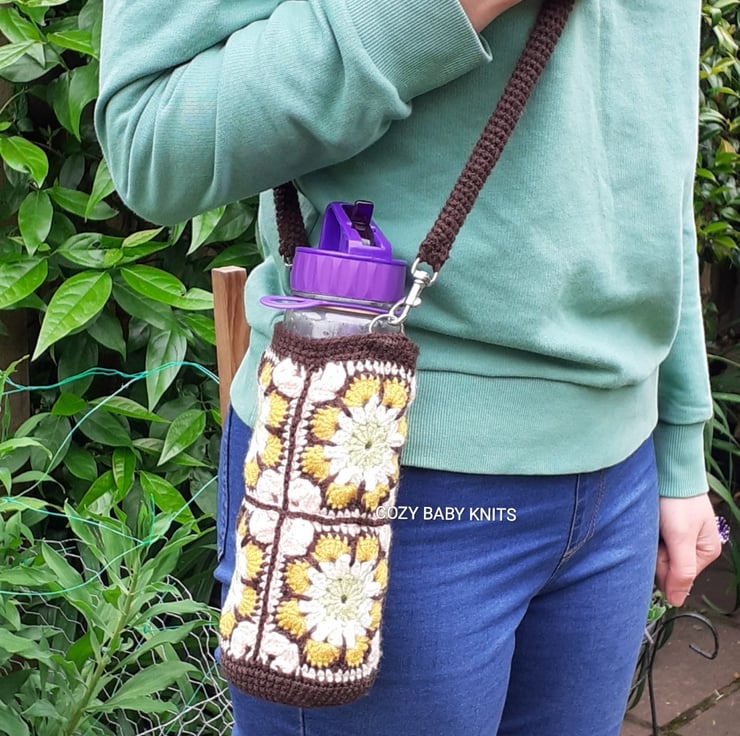 Brown crossbody bottle bag with yellow and green flowers in a granny square with removable strap.
