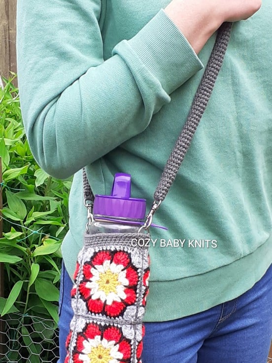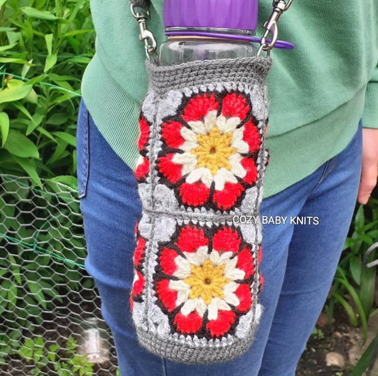 Grey bottle bag with red and yellow flowers in a granny square with removable strap