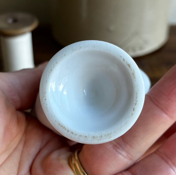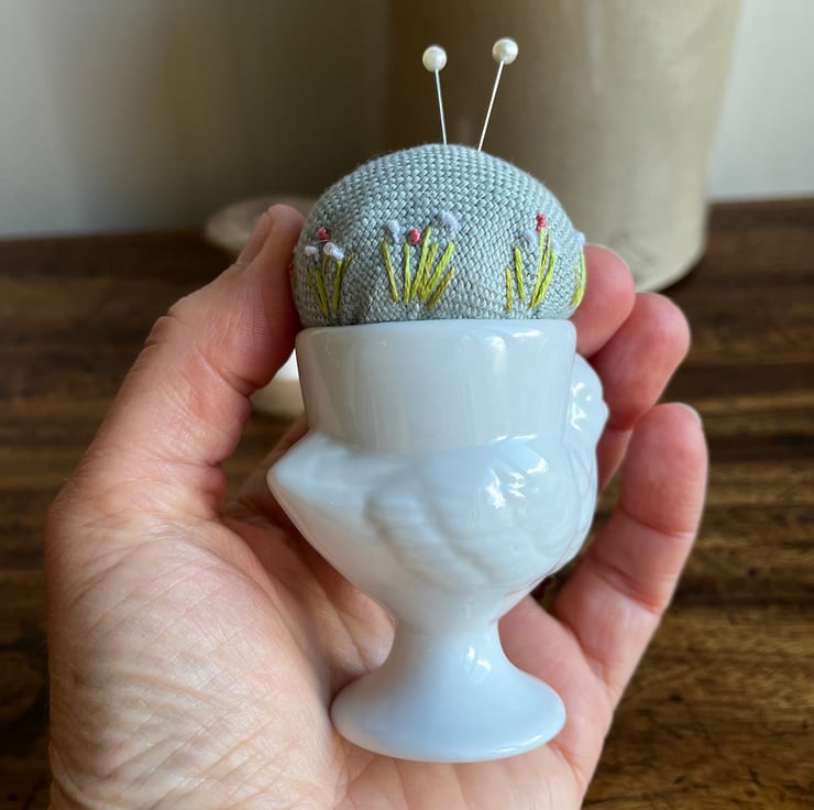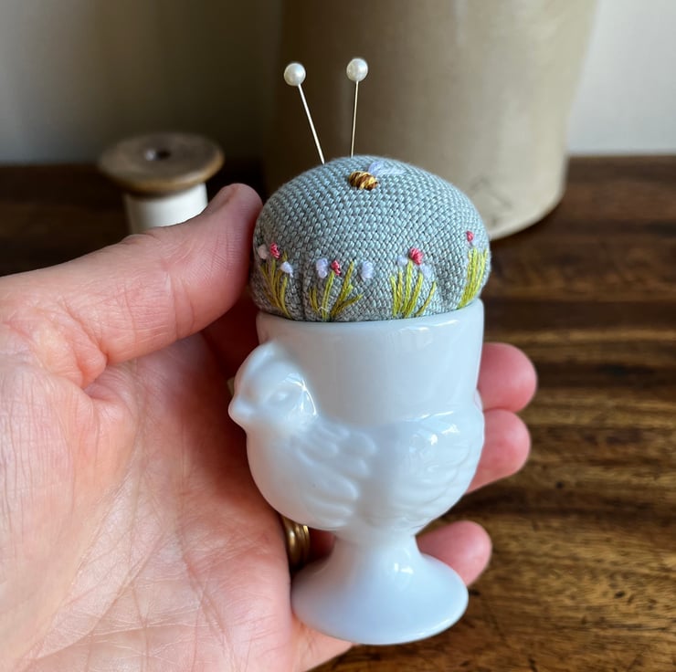 Cute embroidered pincushion in a white egg cup in the shape of a hen. The linen cushion has been embroidered with tiny flowers and a bee.