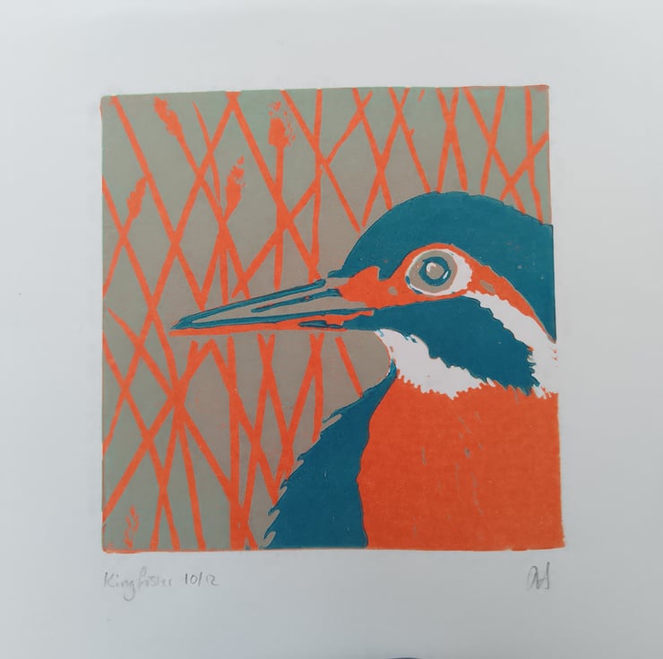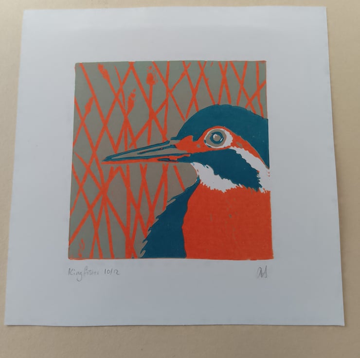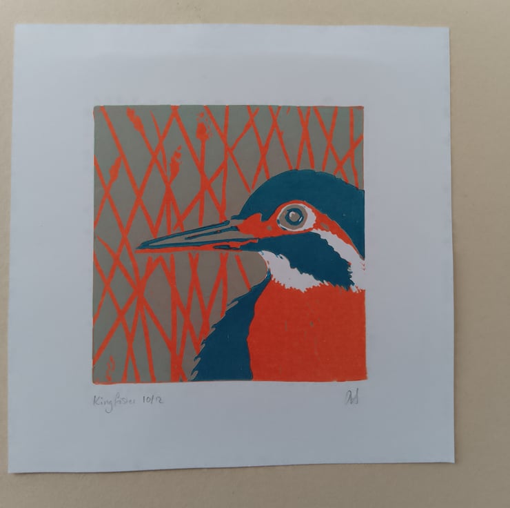 I live near the Somerset levels and love to visit the wetlands and farmlands, where you can see many different species of birds. This kingfisher is part of a series of mini reduction linoprint, others include a heron, cattle egret and great crested Grebe.