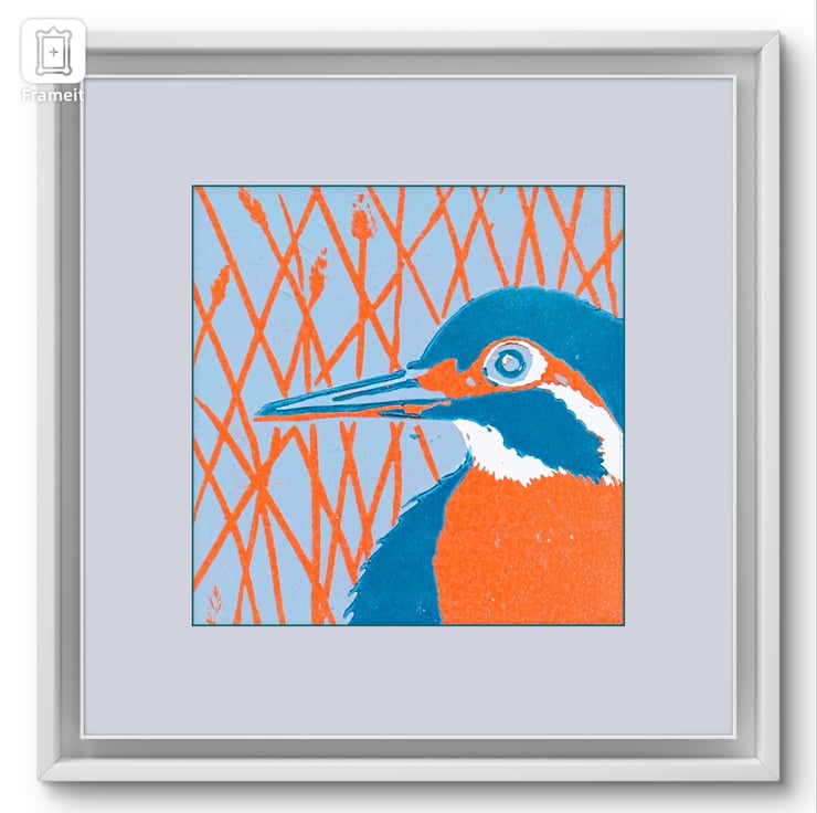 A mini linoprint of a kingfisher made using the reduction method. This is a limited edition of 12, and is part of a series of small prints featuring birds found on the Somerset levels. It measures 10cm2, on white Bristol board paper, the overall size for mounting and framing is roughly 6x6 inches . It is printed in vibrant colours of orange, grey and blue.