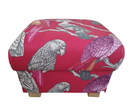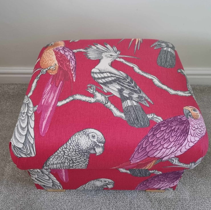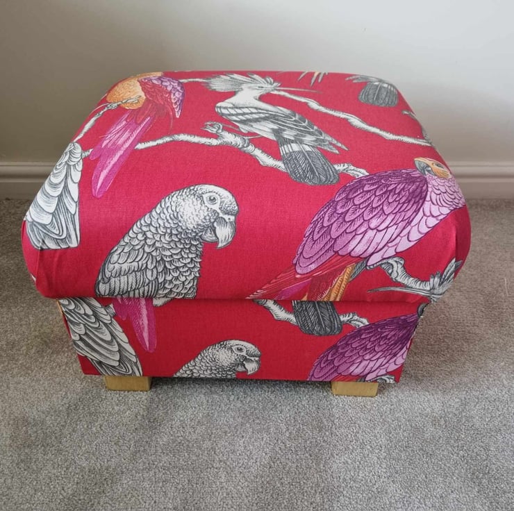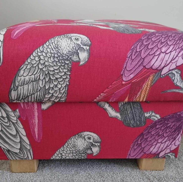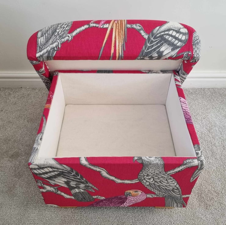 am a professional upholsterer with over 33 years experience, and have handmade this adult sized STORAGE footstool using iliv Aviary Garden in Pomegranate colourway fabric.