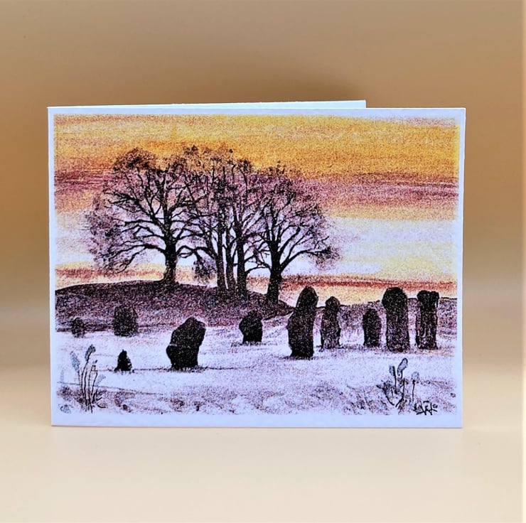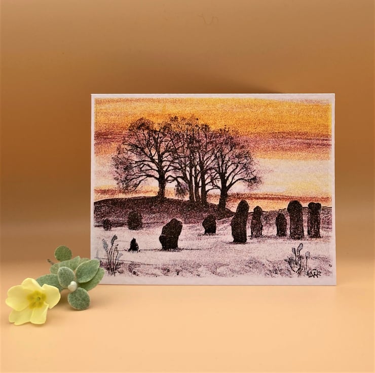 I love cards and keep favorite ones sent to me over the years. This card is an unusual subject and one dear to my heart. The standing stones of Britain are a spectacular reminder of our prehistoric past and even today retain a sense of 'spirit of place'. While we don't know a great deal about the stones significance to our ancestors we can sense that the circles were once at the very heart of life for that society. Avebury dates back nearly 5000 years and is Britain's largest Neolithic Stone Circle. I find historic subjects very inspirational and like to think that someone might keep one of my cards to inspire them and remind them of a special day - they look very attractive when framed. I like to think of Avebury as the very heart of England with a direct connection to our ancient past and it speaks to me far more than its famous cousin 'Stonehenge'. I hope I have captured something of the quiet majesty of the stones.