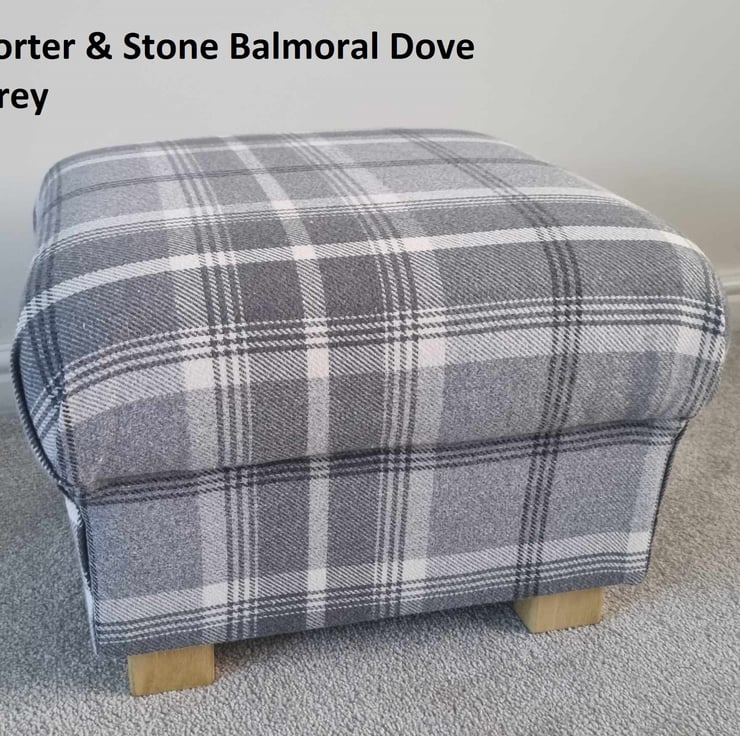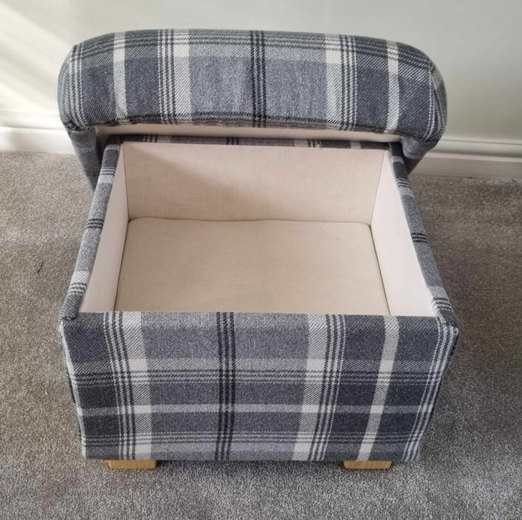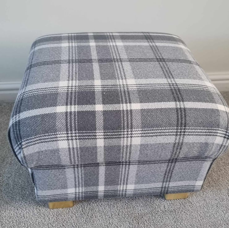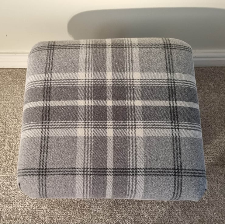 I am a professional upholsterer with over 33 years experience, and have handmade this adult sized STORAGE footstool using Porter & Stone Balmoral Check in Dove Grey fabric.