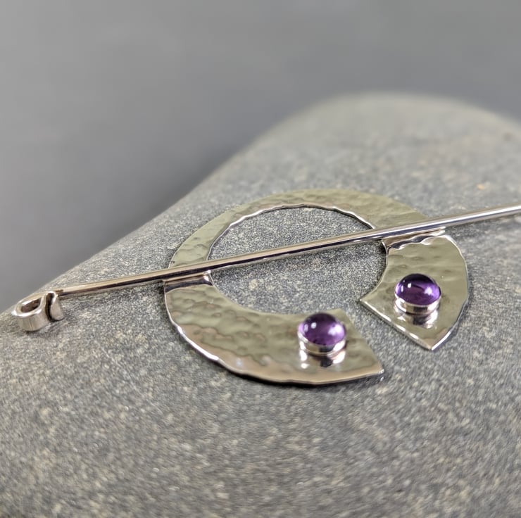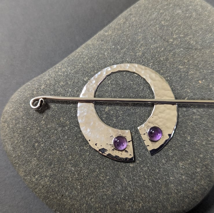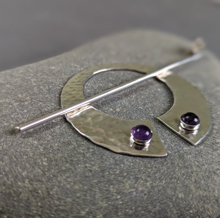 A perfect fastening for a shawl or cardigan without buttons, but also an unusual and eye catching piece of jewellery. Made from sterling silver which I have hand beaten then added lovely purple amethyst gem stones. Together with the lovely polished sterling silver shepherds crook style pin this is an unusual and useful adornment. Overall measurement 2"/50mm.