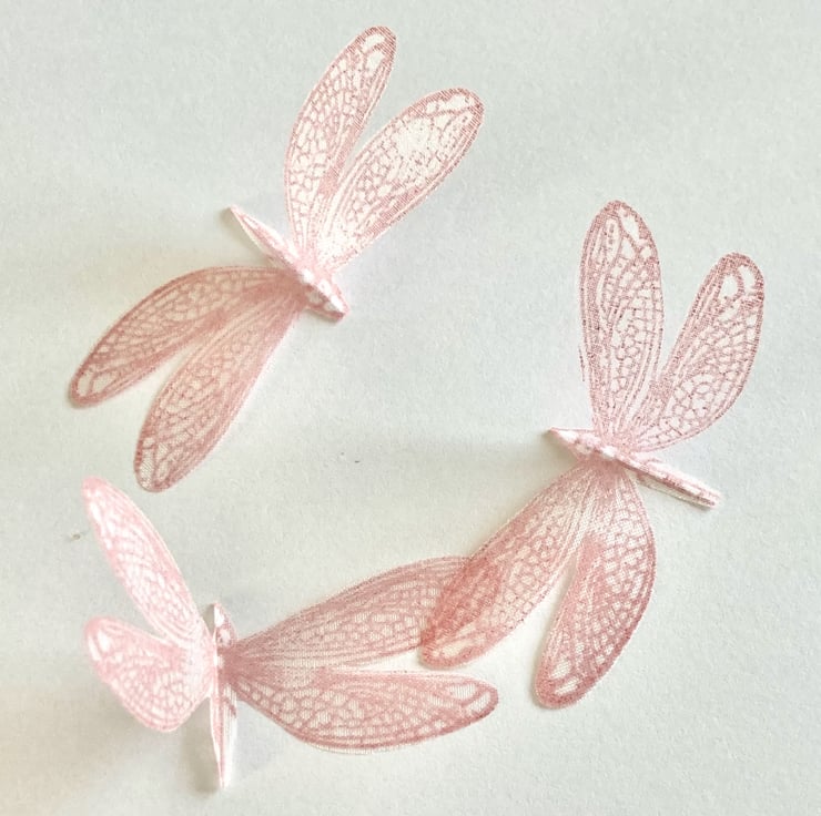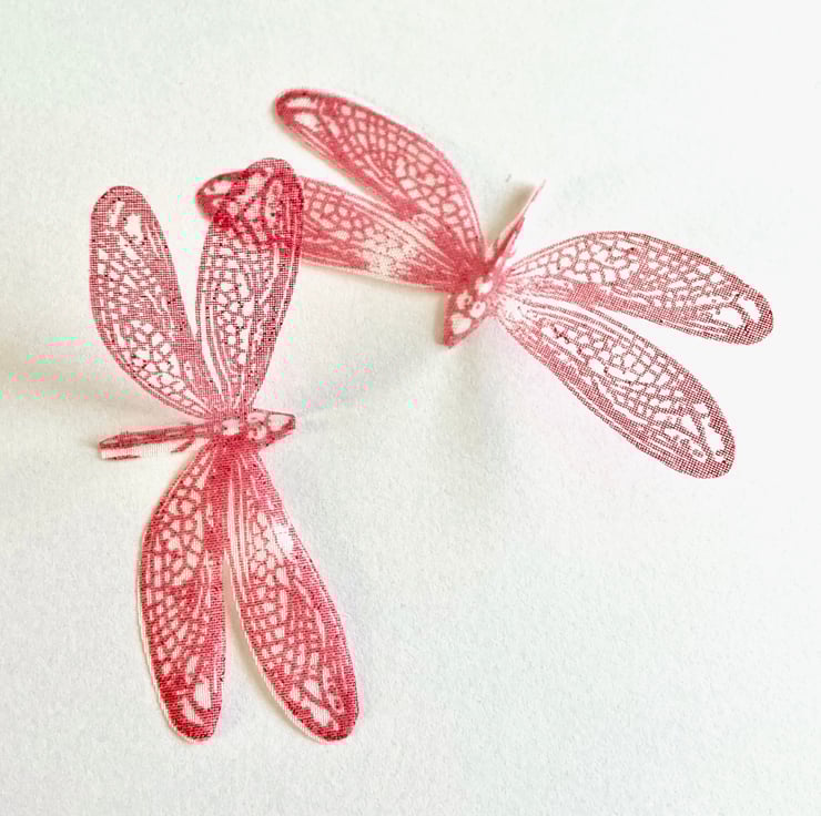 High quality silk organza is hand block printed using the finest Japanese ink dyes and stiffened in the same way we do to make silk flowers and this is then cut to create these delicate Dragonflies.