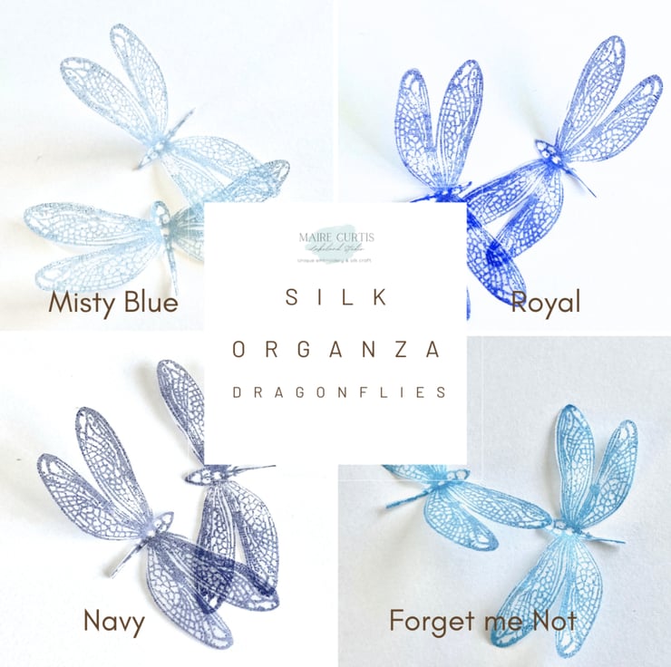 Pure silk organza Dragonflies in packs of 10 in a range of shades of blue.