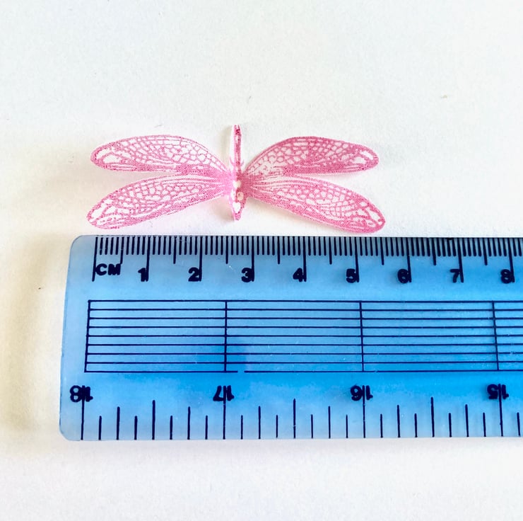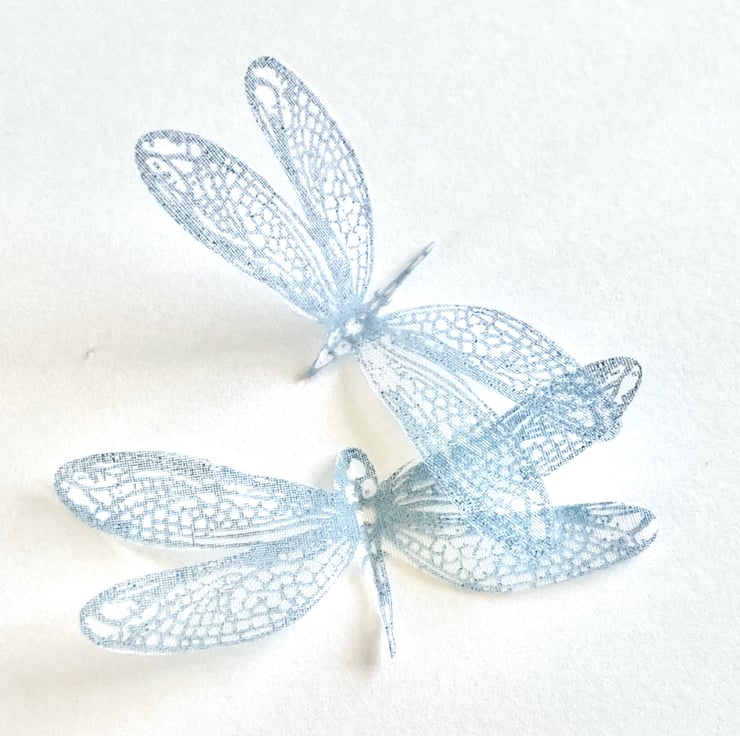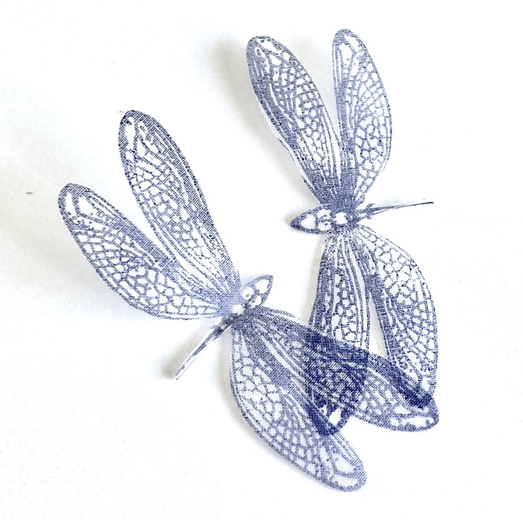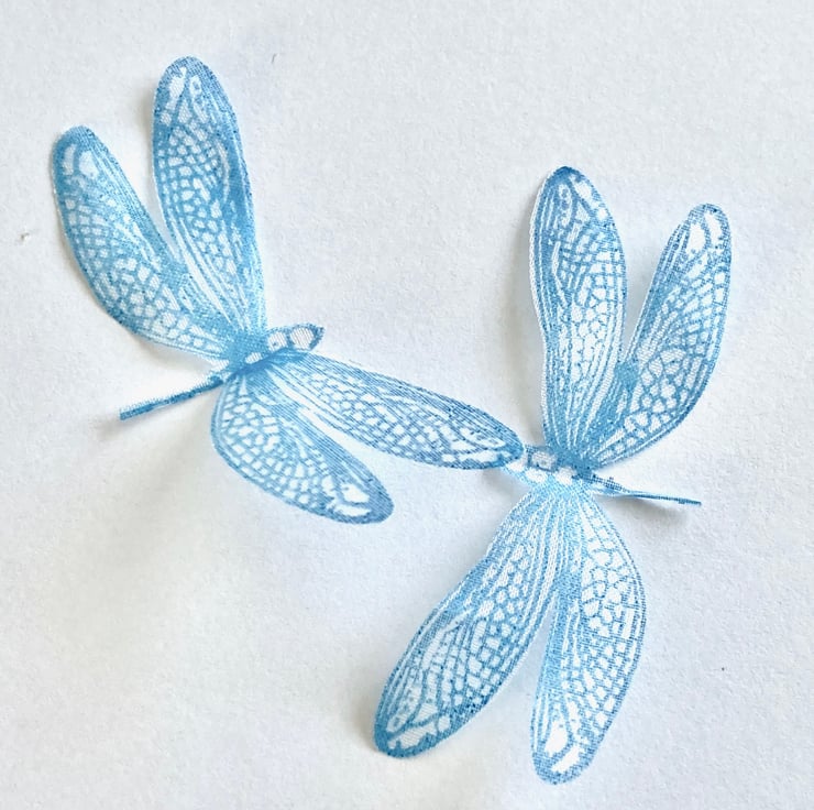 High quality silk organza is hand block printed using the finest Japanese ink dyes and stiffened in the same way we do to make silk flowers and this is then cut to create these delicate Dragonflies.