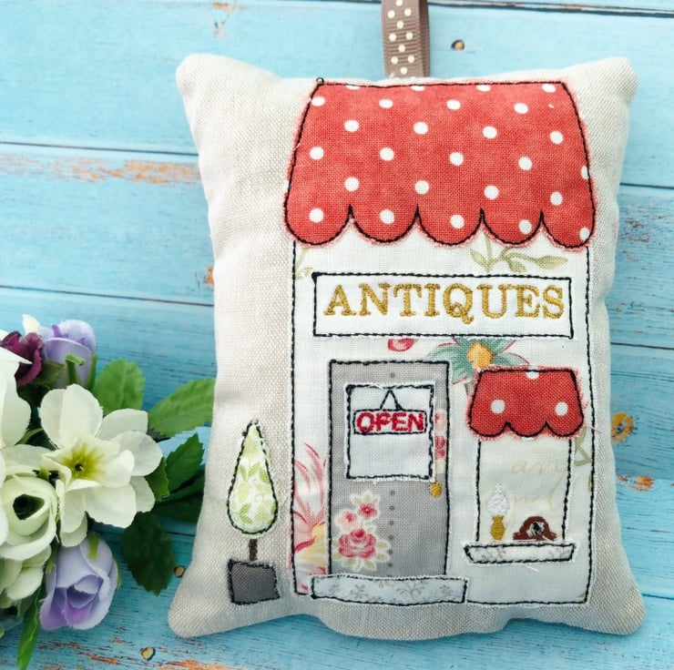 This adorable shop Lavender bag has a Mantle clock and Gas Lamp in the window of an old fashioned Antique Shop front made into a lavender bag