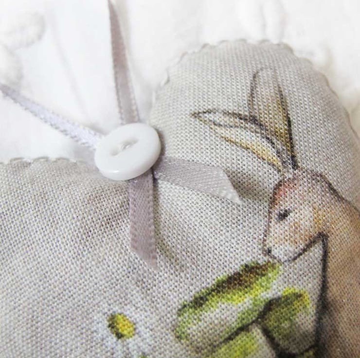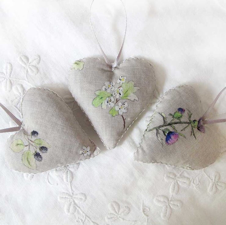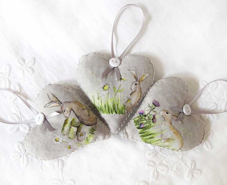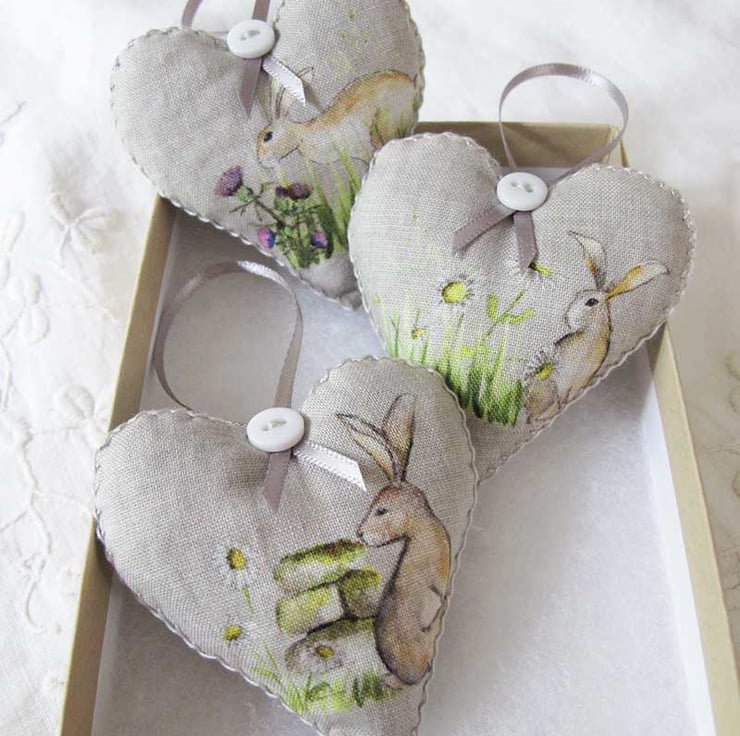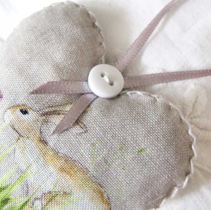 buttons. The hearts feature little rabbits on one side and either Blackberries, Hawthorn blossom or Thistles on the other, all on delicate pale taupe background. The hearts measure 6cm wide x 6.5cm long (not including the ribbon).