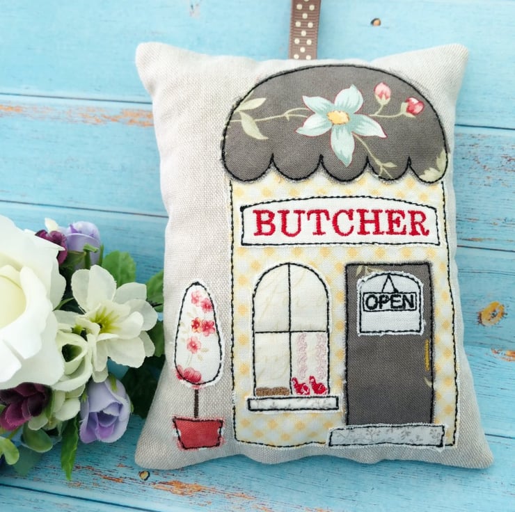 This adorable shop Lavender bag has Sausages, Steak and Pies in the window of an old fashioned Butchers Shop front made into a lavender bag