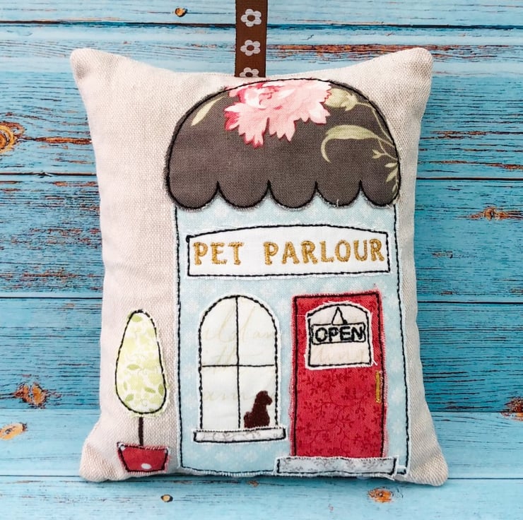 This adorable shop Lavender bag has a Dog sat in the window of an old fashioned Pet Parlour Shop front made into a lavender bag