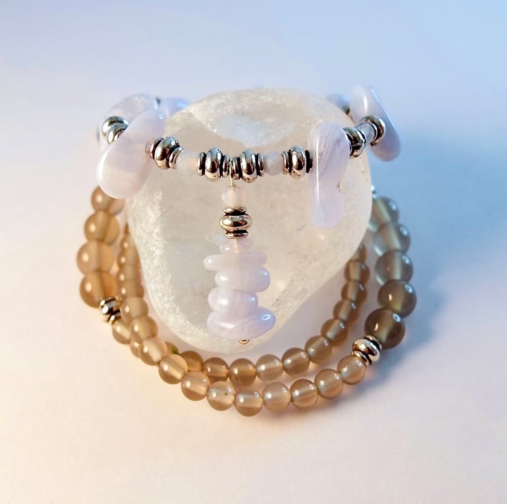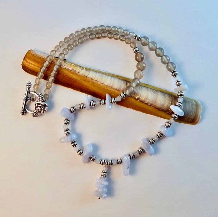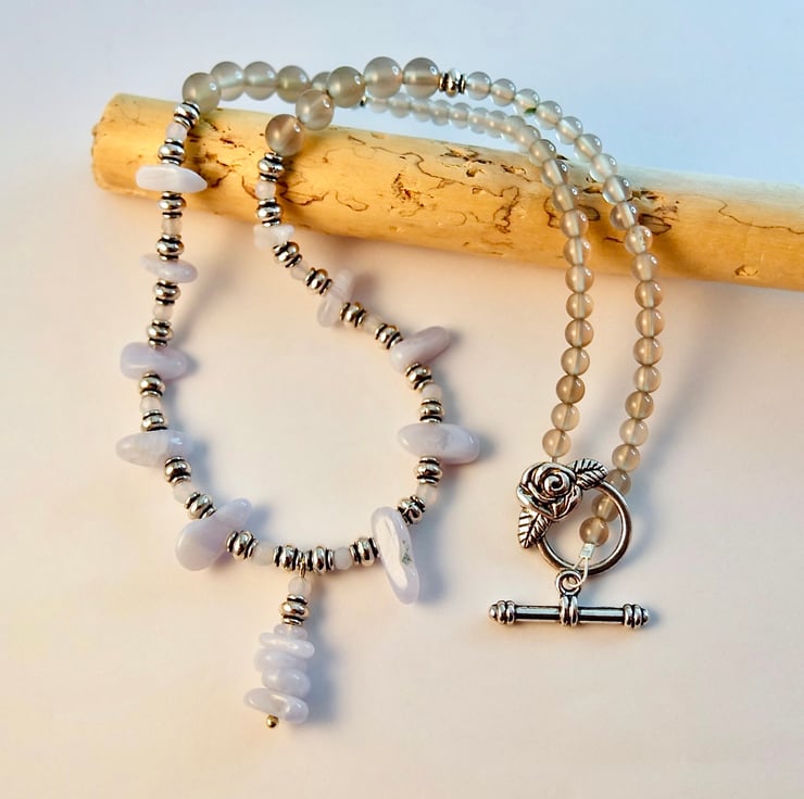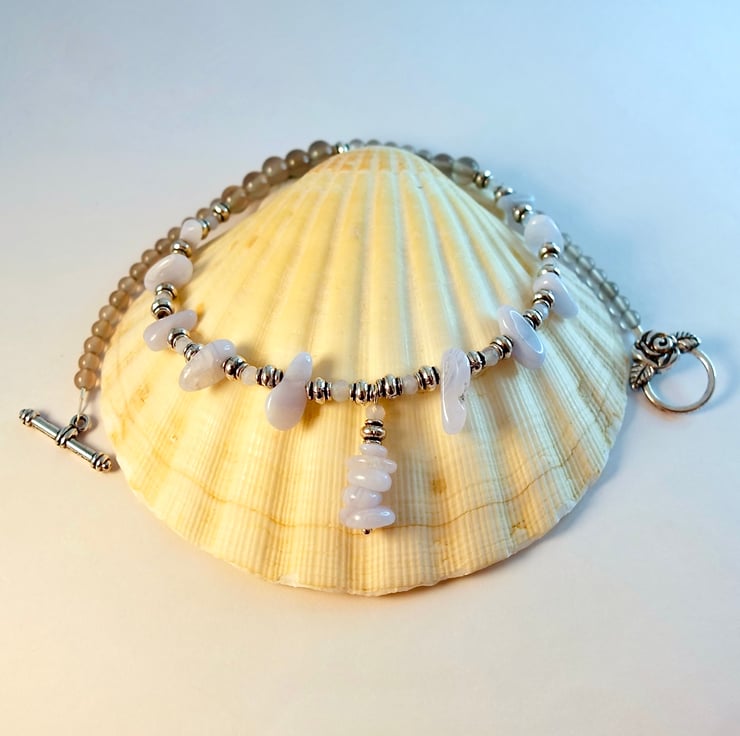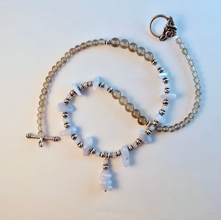 As a centrepiece, I have made a pendant of five Blue Lace Agate chips topped with a lantern spacer and faceted Chalcedony bead.
