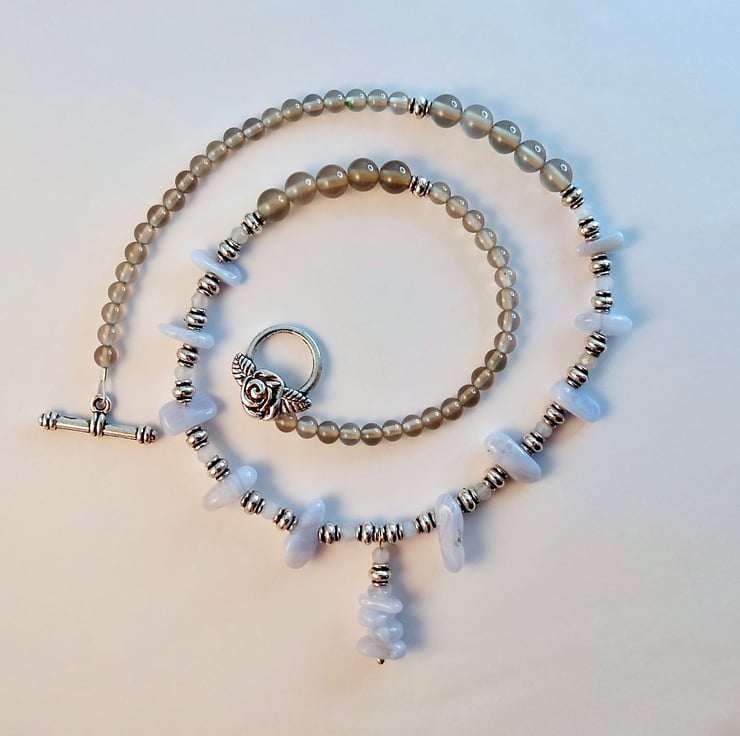 The necklace continues with 6mm light grey Agate, graduating to 4mm beads, and fastens with a Tibetan silver rose toggle clasp.