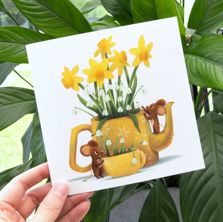 Two cheeky mice arranging snowdrops and daffodils in a teapot. The card is blank inside so it's perfect for birthday, congratulations, Mother's Day or even just to say hello.